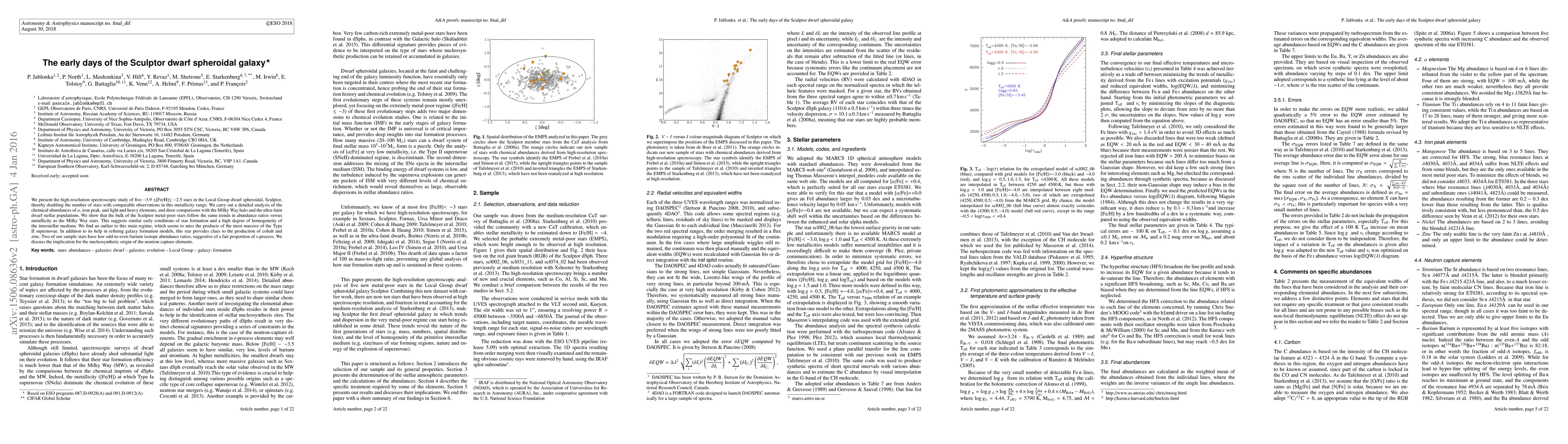 This paper presents a high-resolution spectroscopic study of five metal-poor stars in the Sculptor dwarf galaxy, revealing similar abundance trends to the Milky Way and suggesting homogeneous early star formation conditions. An outlier star lacks products from massive Type II supernovae, providing insights into cobalt and zinc production.
