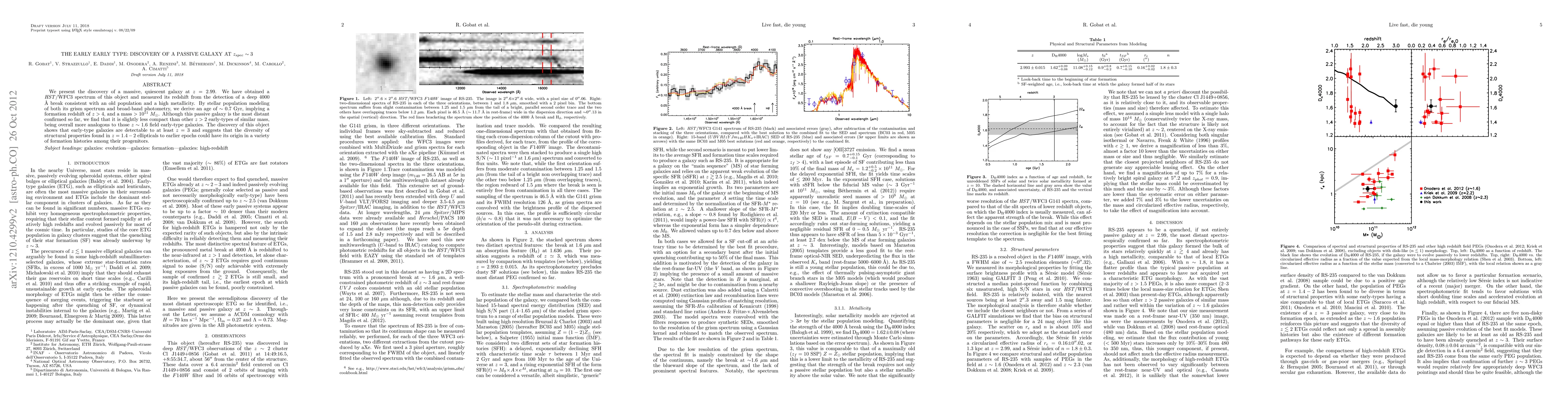 We present the discovery of a massive, quiescent galaxy at z=2.99. We have obtained a HST/WFC3 spectrum of this object and measured its redshift from the detection of a deep 4000A break consistent with an old population and a high metallicity. By stellar population modeling of both its grism spectrum and broad-band photometry, we derive an age of ~0.7 Gyr, implying a formation redshift of z>4, and a mass >10^11 Msun. Although this passive galaxy is the most distant confirmed so far, we find that it is slightly less compact than other z>2 early-types of similar mass, being overall more analogous to those z~1.6 field early-type galaxies. The discovery of this object shows that early-type galaxies are detectable to at least z=3 and suggests that the diversity of structural properties found in z=1.4-2 ellipticals to earlier epochs could have its origin in a variety of formation histories among their progenitors.