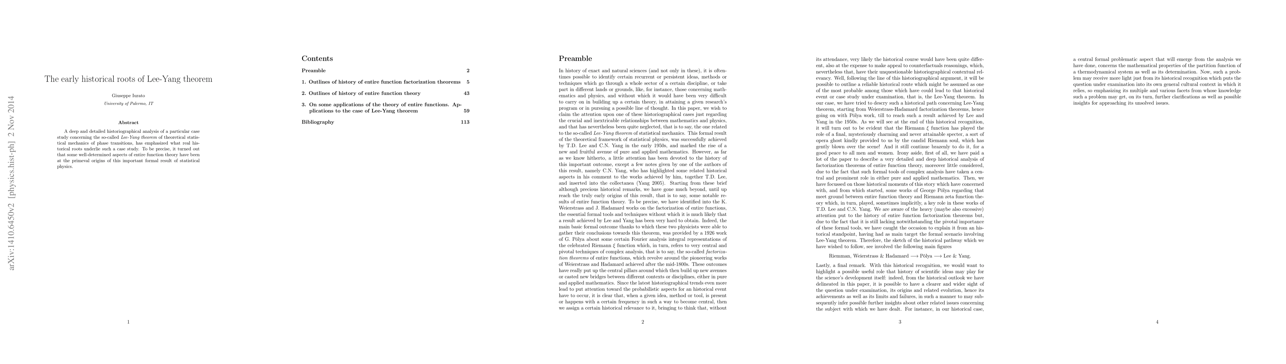 A deep and detailed historiographical analysis of a particular case study concerning the so-called Lee-Yang theorem of theoretical statistical mechanics of phase transitions, has emphasized what real historical roots underlie such a case study. To be precise, it turned out that some well-determined aspects of entire function theory have been at the primeval origins of this important formal result of statistical physics.