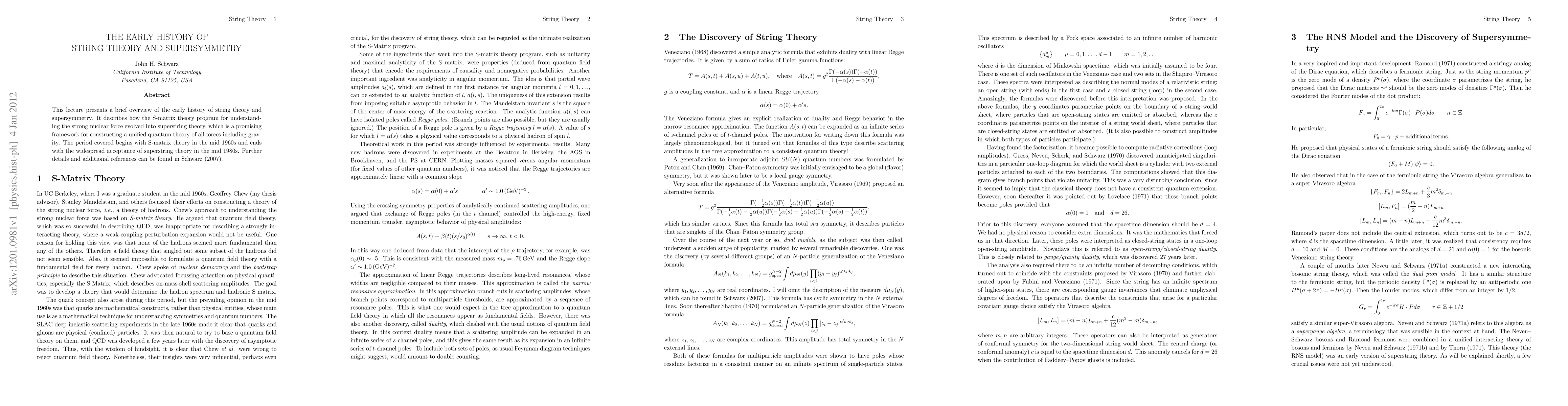 This lecture presents a brief overview of the early history of string theory and supersymmetry. It describes how the S-matrix theory program for understanding the strong nuclear force evolved into superstring theory, which is a promising framework for constructing a unified quantum theory of all forces including gravity. The period covered begins with S-matrix theory in the mid 1960s and ends with the widespread acceptance of superstring theory in the mid 1980s. Further details and additional references can be found in Schwarz (2007).