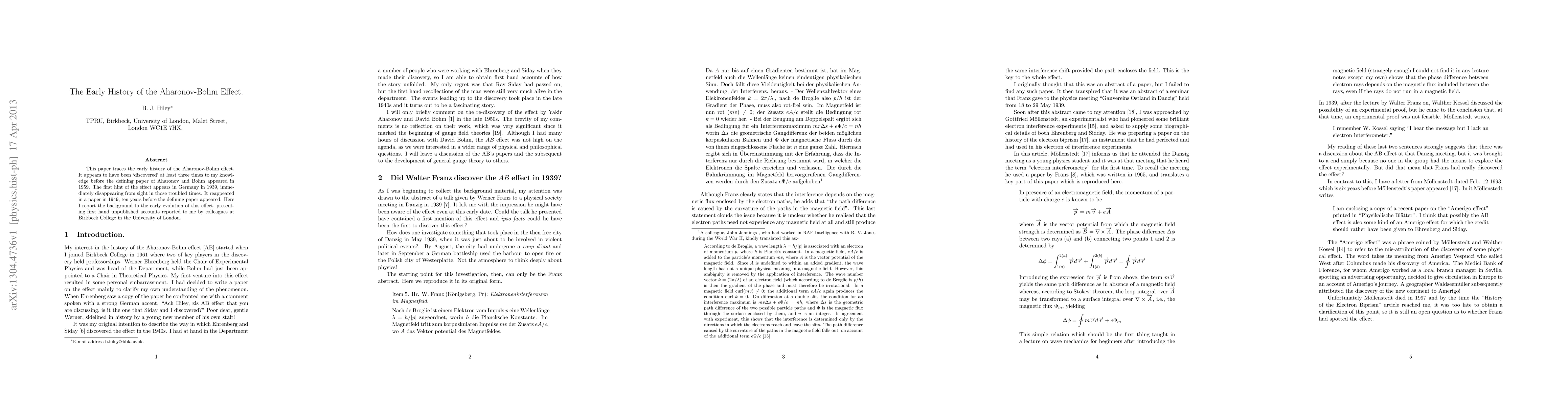 This paper traces the early history of the Aharonov-Bohm effect. It appears to have been `discovered' at least three times to my knowledge before the defining paper of Aharonov and Bohm appeared in 1959. The first hint of the effect appears in Germany in 1939, immediately disappearing from sight in those troubled times. It reappeared in a paper in 1949, ten years before the defining paper appeared. Here I report the background to the early evolution of this effect, presenting first hand unpublished accounts reported to me by colleagues at Birkbeck College in the University of London.