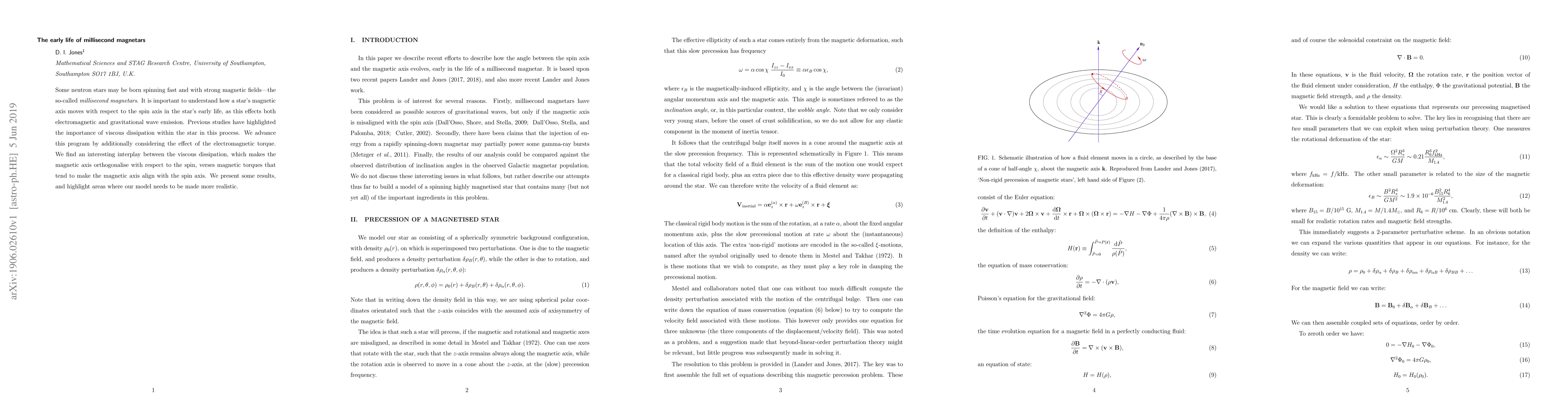 This research explores the early life of millisecond magnetars, a type of neutron star with rapid rotation and strong magnetic fields. It highlights the interplay between viscous dissipation, which causes the magnetic axis to orthogonalize with respect to the spin, and magnetic torques that tend to align the magnetic axis with the spin axis. The study presents results and identifies areas needing further refinement in the model.