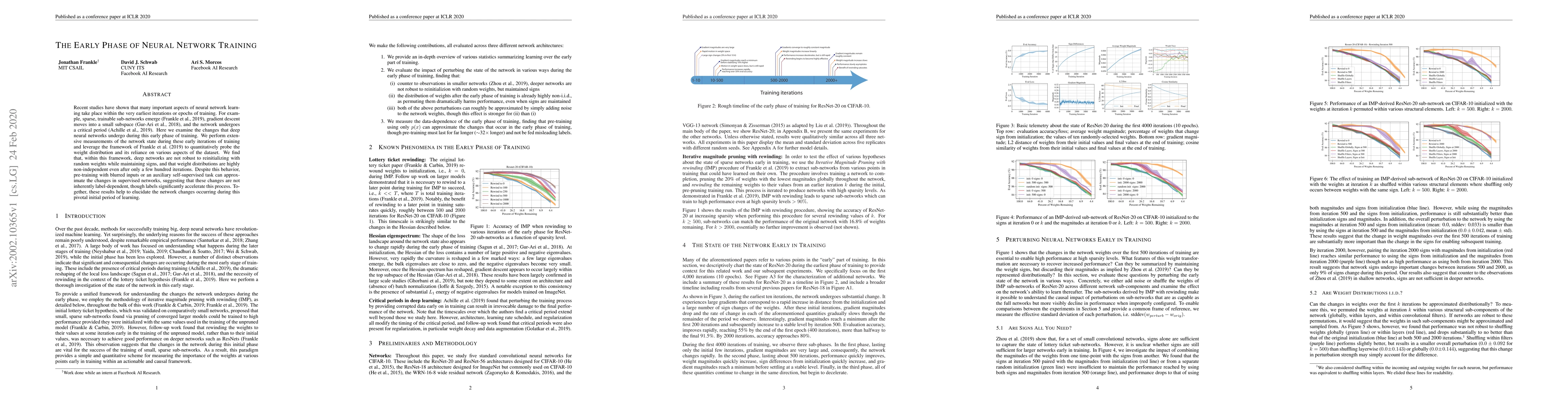 Recent studies have shown that many important aspects of neural network learning take place within the very earliest iterations or epochs of training. For example, sparse, trainable sub-networks emerge (Frankle et al., 2019), gradient descent moves into a small subspace (Gur-Ari et al., 2018), and the network undergoes a critical period (Achille et al., 2019). Here, we examine the changes that deep neural networks undergo during this early phase of training. We perform extensive measurements of the network state during these early iterations of training and leverage the framework of Frankle et al. (2019) to quantitatively probe the weight distribution and its reliance on various aspects of the dataset. We find that, within this framework, deep networks are not robust to reinitializing with random weights while maintaining signs, and that weight distributions are highly non-independent even after only a few hundred iterations. Despite this behavior, pre-training with blurred inputs or an auxiliary self-supervised task can approximate the changes in supervised networks, suggesting that these changes are not inherently label-dependent, though labels significantly accelerate this process. Together, these results help to elucidate the network changes occurring during this pivotal initial period of learning.