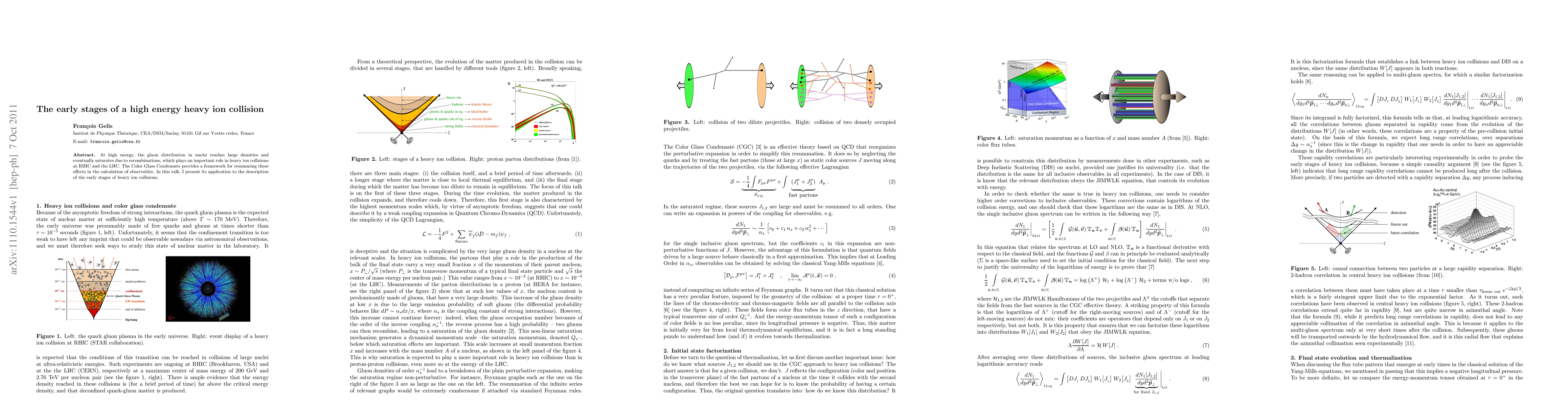 This paper explores the early stages of high energy heavy ion collisions, focusing on the saturation of gluon distributions in nuclei due to recombinations. It applies the Color Glass Condensate framework to calculate these effects and describe the dynamics of such collisions at RHIC and the LHC.