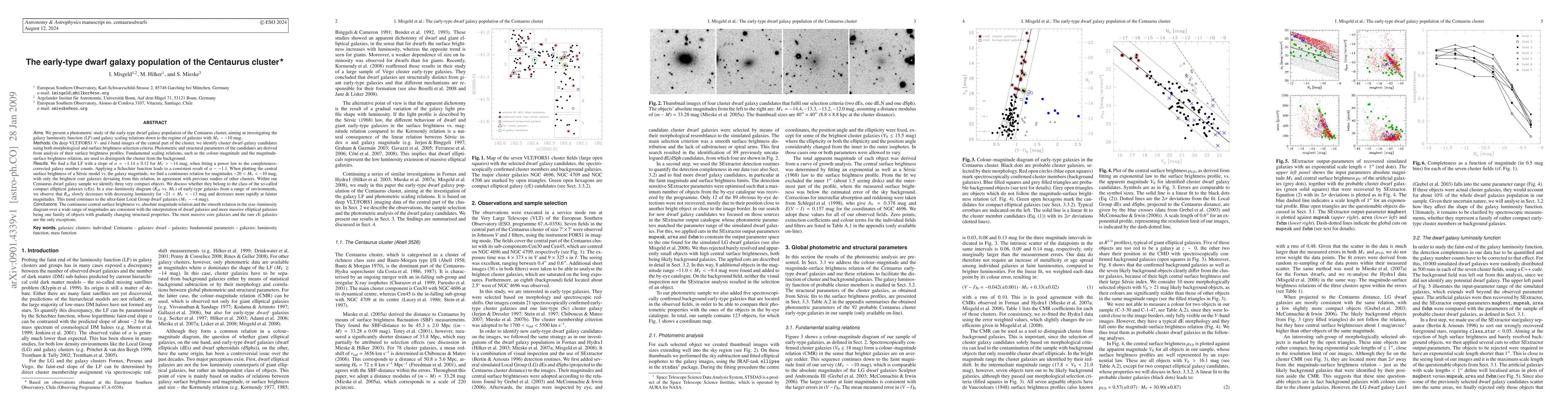 This study investigates the early-type dwarf galaxy population in the Centaurus cluster, finding a flat luminosity function and continuous scaling relations for galaxies down to M_V~-10 mag. The research suggests that dwarf galaxies and massive ellipticals share gradual structural properties, except for the most luminous core galaxies.