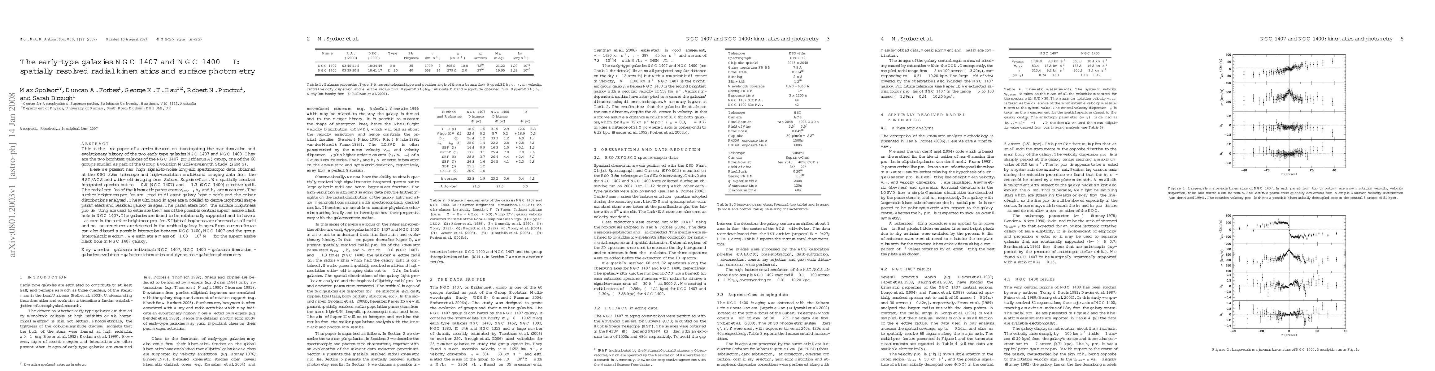 This is the first paper of a series focused on investigating the star formation and evolutionary history of the two early-type galaxies NGC 1407 and NGC 1400. They are the two brightest galaxies of the NGC 1407 (or Eridanus-A) group, one of the 60 groups studied as part of the Group Evolution Multi-wavelength Study (GEMS). Here we present new high signal-to-noise long-slit spectroscopic data obtained at the ESO 3.6m telescope and high-resolution multi-band imaging data from the HST/ACS and wide-field imaging from Subaru Suprime-Cam. We spatially resolved integrated spectra out to 0.6 (NGC 1407) and 1.3 (NGC 1400) effective radii. The radial profiles of the kinematic parameters v(rot), sigma, h3 and h4 are measured. The surface brightness profiles are fitted to different galaxy light models and the colour distributions analysed. The multi-band images are modelled to derive isophotal shape parameters and residual galaxy images. The parameters from the surface brightness profile fitting are used to estimate the mass of the possible central supermassive black hole in NGC 1407. The galaxies are found to be rotationally supported and to have a flat core in the surface brightness profiles. Elliptical isophotes are observed at all radii and no fine structures are detected in the residual galaxy images. From our results we can also discard a possible interaction between NGC 1400, NGC 1407 and the group intergalactic medium. We estimate a mass of 1.03x10^9 M(sun) for the supermassive black hole in NGC 1407 galaxy.
