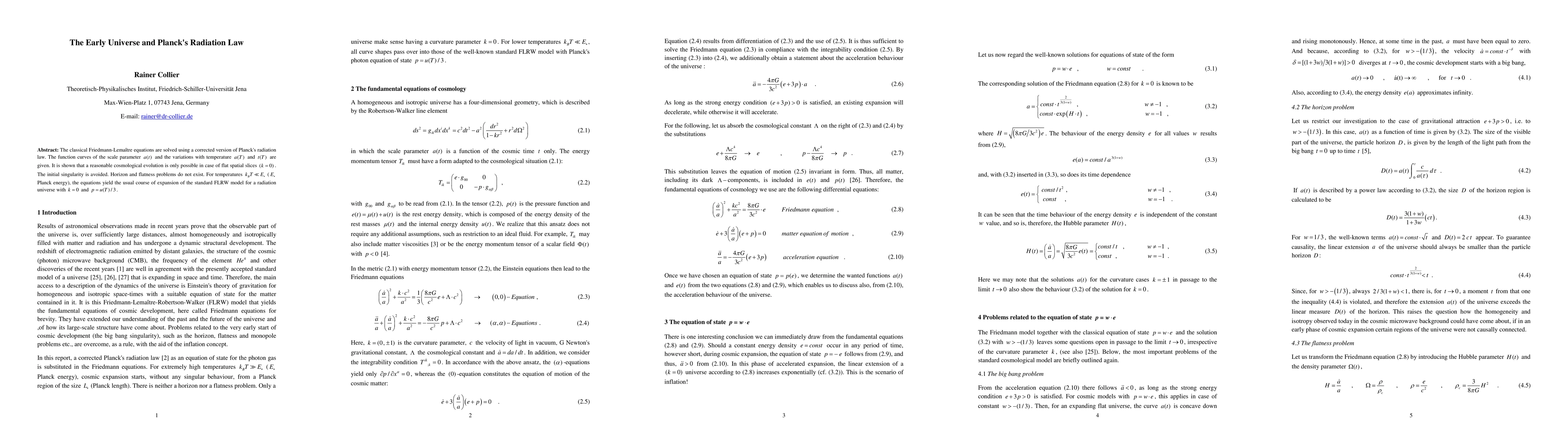 Researchers solved Friedmann-Lema extit{^}tre equations using a corrected version of Planck's radiation law, showing that only flat spatial slices avoid cosmological problems and yield the standard expansion course for a radiation universe.