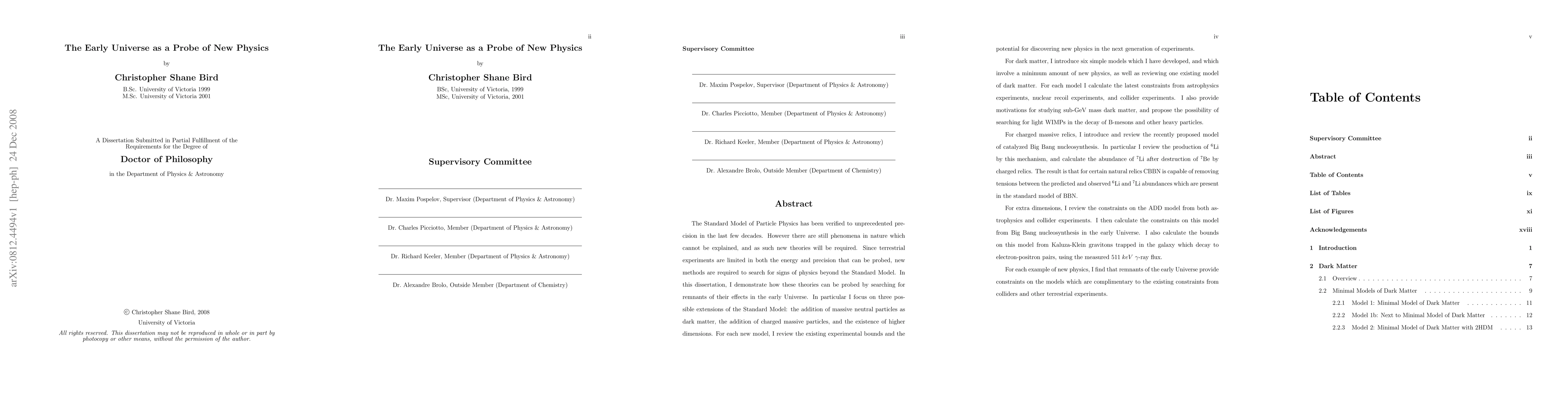 The Standard Model of Particle Physics has been verified to unprecedented precision in the last few decades. However there are still phenomena in nature which cannot be explained, and as such new theories will be required. Since terrestrial experiments are limited in both the energy and precision that can be probed, new methods are required to search for signs of physics beyond the Standard Model. In this dissertation, I demonstrate how these theories can be probed by searching for remnants of their effects in the early Universe. In particular I focus on three possible extensions of the Standard Model: the addition of massive neutral particles as dark matter (through the use of several minimal models of dark matter), the addition of charged massive particles (through catalyzed Big Bang Nucleosynthesis), and the existence of higher dimensions (through its effects on BBN and galactic positron production). For each new model, I review the existing experimental bounds and the potential for discovering new physics in the next generation of experiments.