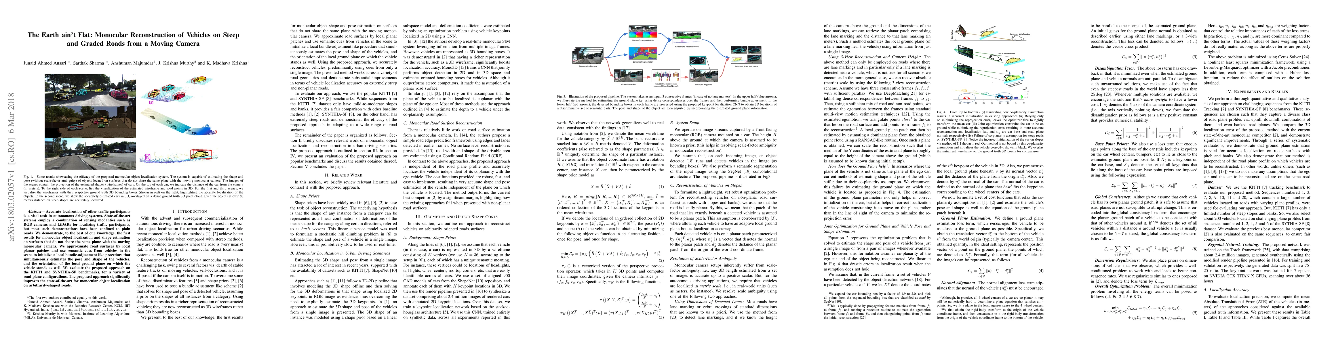 Accurate localization of other traffic participants is a vital task in autonomous driving systems. State-of-the-art systems employ a combination of sensing modalities such as RGB cameras and LiDARs for localizing traffic participants, but most such demonstrations have been confined to plain roads. We demonstrate, to the best of our knowledge, the first results for monocular object localization and shape estimation on surfaces that do not share the same plane with the moving monocular camera. We approximate road surfaces by local planar patches and use semantic cues from vehicles in the scene to initialize a local bundle-adjustment like procedure that simultaneously estimates the pose and shape of the vehicles, and the orientation of the local ground plane on which the vehicle stands as well. We evaluate the proposed approach on the KITTI and SYNTHIA-SF benchmarks, for a variety of road plane configurations. The proposed approach significantly improves the state-of-the-art for monocular object localization on arbitrarily-shaped roads.