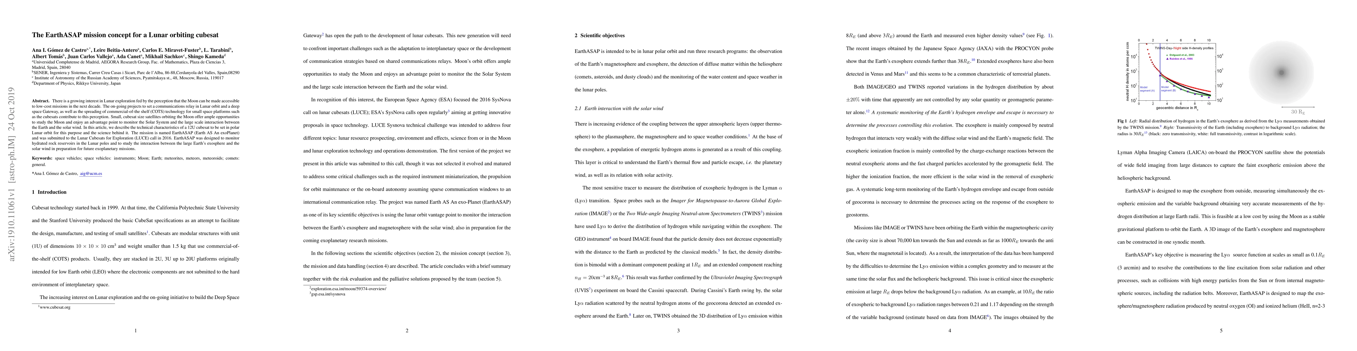 The EarthASAP mission proposes a 12U cubesat for polar Lunar orbit to study hydrated rock reservoirs and Earth's exosphere-solar wind interaction, leveraging COTS technology. Submitted in 2016, it aims to prepare for future exoplanetary missions.