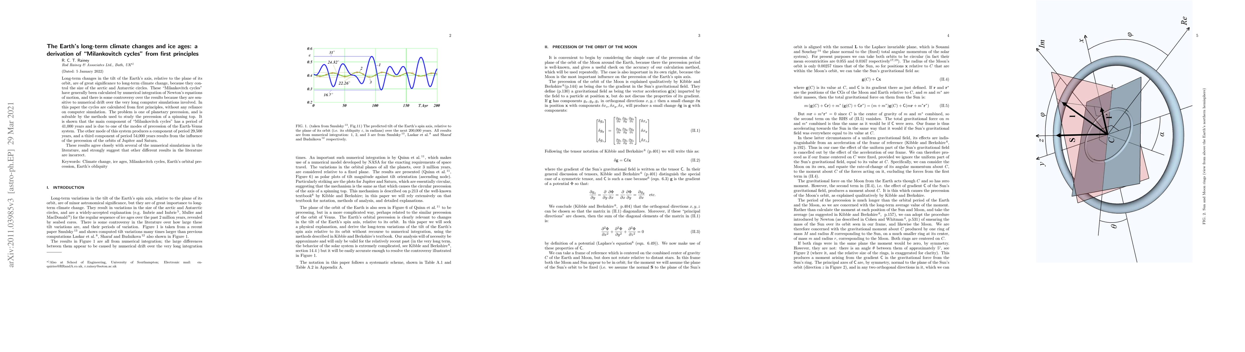 This paper derives Milankovitch cycles—long-term climate changes driven by Earth's axial tilt variations—from first principles without numerical simulations. It identifies three main components with periods of 41,000, 29,500, and 54,000 years, aligning closely with some numerical models and suggesting discrepancies in others.
