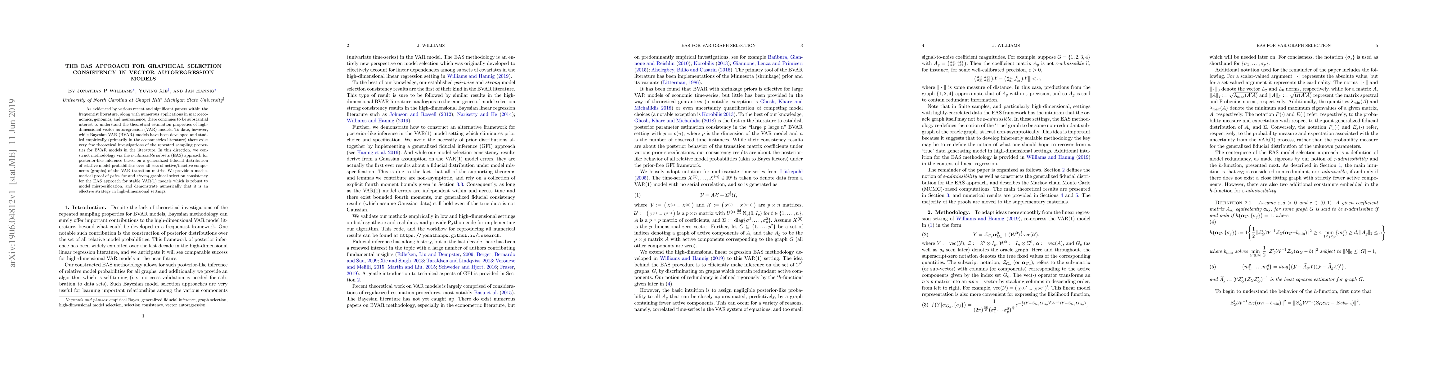 This paper develops an $\varepsilon$-$admissible$ subsets (EAS) approach for posterior-like inference in high-dimensional vector autoregression (VAR) models, proving pairwise and strong graphical selection consistency in stable VAR(1) models, and demonstrating its effectiveness in high-dimensional settings. The methodology is robust to model misspecification and extends theoretical understanding of Bayesian VAR models.