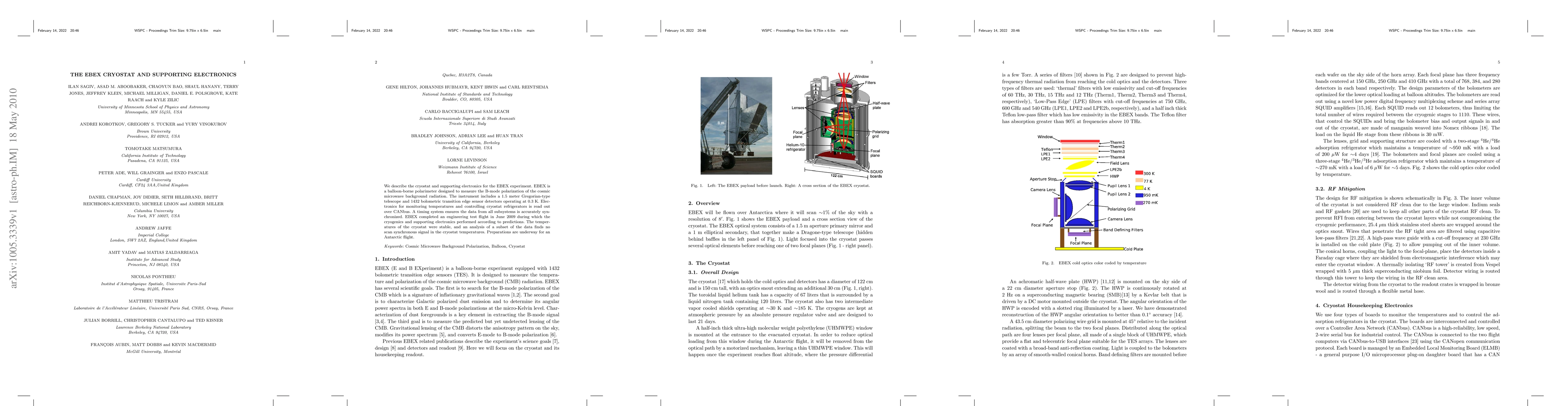 We describe the cryostat and supporting electronics for the EBEX experiment. EBEX is a balloon-borne polarimeter designed to measure the B-mode polarization of the cosmic microwave background radiation. The instrument includes a 1.5 meter Gregorian-type telescope and 1432 bolometric transition edge sensor detectors operating at 0.3 K. Electronics for monitoring temperatures and controlling cryostat refrigerators is read out over CANbus. A timing system ensures the data from all subsystems is accurately synchronized. EBEX completed an engineering test flight in June 2009 during which the cryogenics and supporting electronics performed according to predictions. The temperatures of the cryostat were stable, and an analysis of a subset of the data finds no scan synchronous signal in the cryostat temperatures. Preparations are underway for an Antarctic flight.