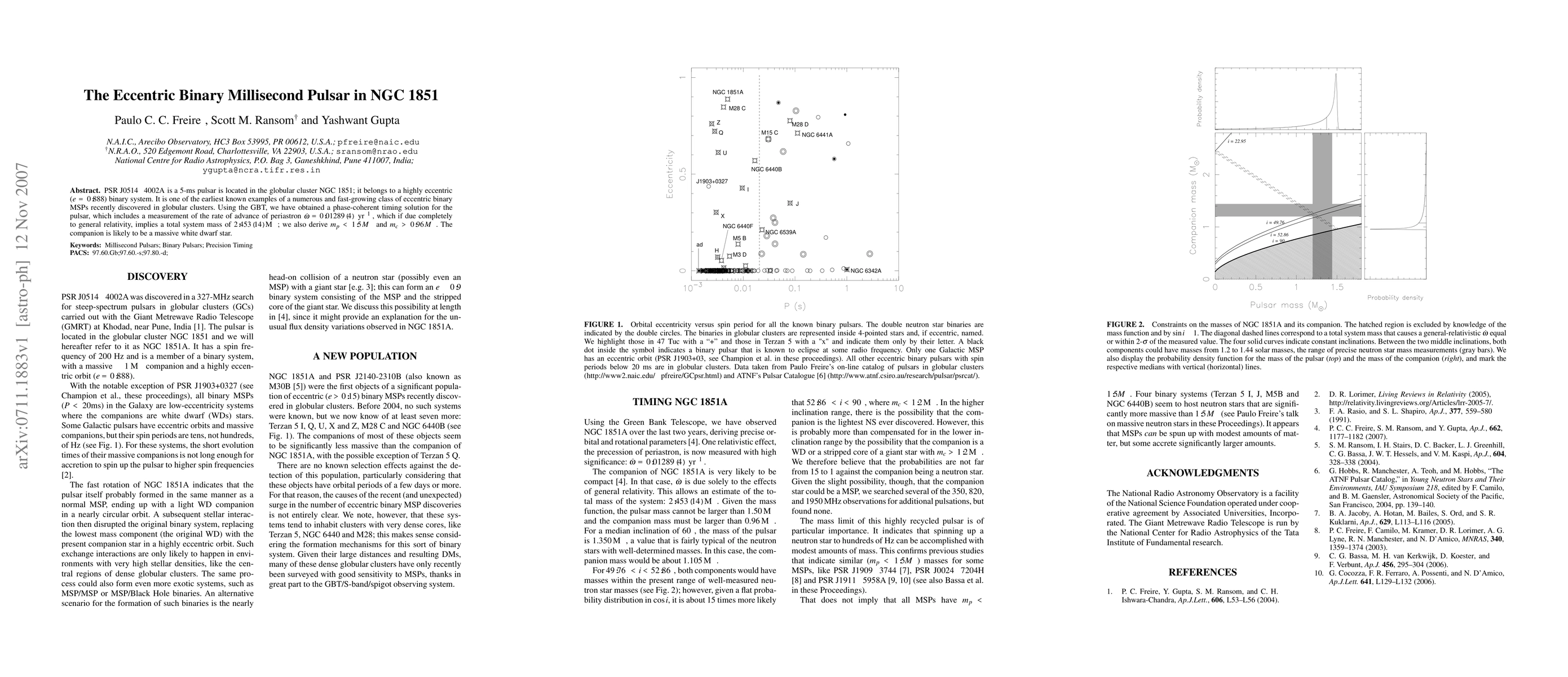 This paper investigates PSR J0514-4002A, a 5-ms millisecond pulsar in the globular cluster NGC 1851, which is part of a highly eccentric binary system. The study provides a phase-coherent timing solution and estimates the system mass at 2.453 solar masses, suggesting the companion is a massive white dwarf.