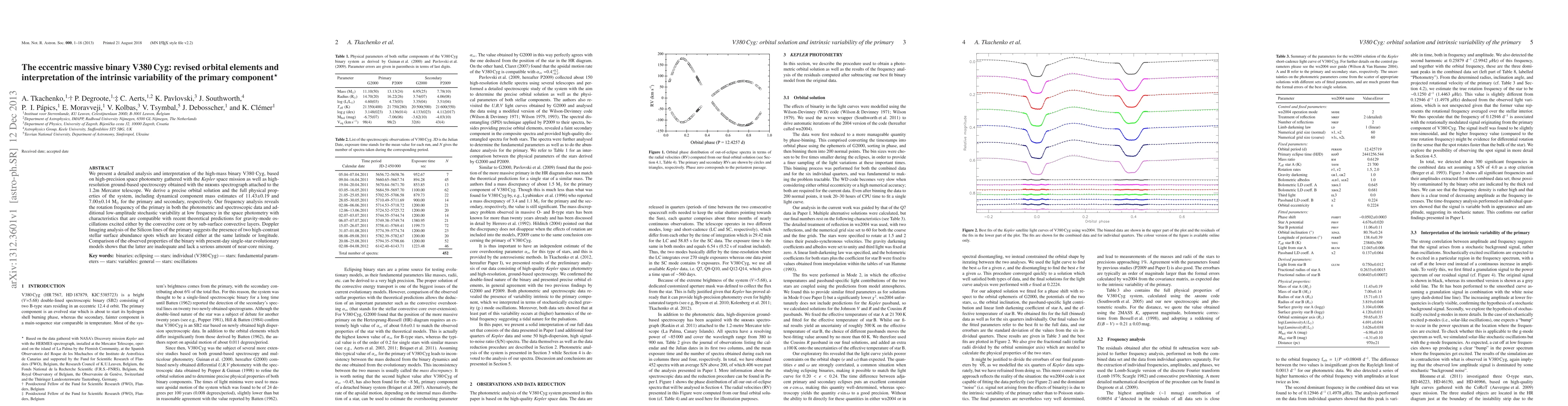 We present a detailed analysis and interpretation of the high-mass binary V380 Cyg, based on high-precision space photometry gathered with the Kepler space mission as well as high-resolution ground-based spectroscopy obtained with the HERMES spectrograph attached to the 1.2m Mercator telescope. We derive a precise orbital solution and the full physical properties of the system, including dynamical component mass estimates of 11.43+/-0.19 and 7.00+/-0.14 solar masses for the primary and secondary, respectively. Our frequency analysis reveals the rotation frequency of the primary in both the photometric and spectroscopic data and additional low-amplitude stochastic variability at low frequency in the space photometry with characteristics that are compatible with recent theoretical predictions for gravity-mode oscillations excited either by the convective core or by sub-surface convective layers. Doppler Imaging analysis of the silicon lines of the primary suggests the presence of two high-contrast stellar surface abundance spots which are located either at the same latitude or longitude. Comparison of the observed properties of the binary with present-day single-star evolutionary models shows that the latter are inadequate and lack a serious amount of near-core mixing.