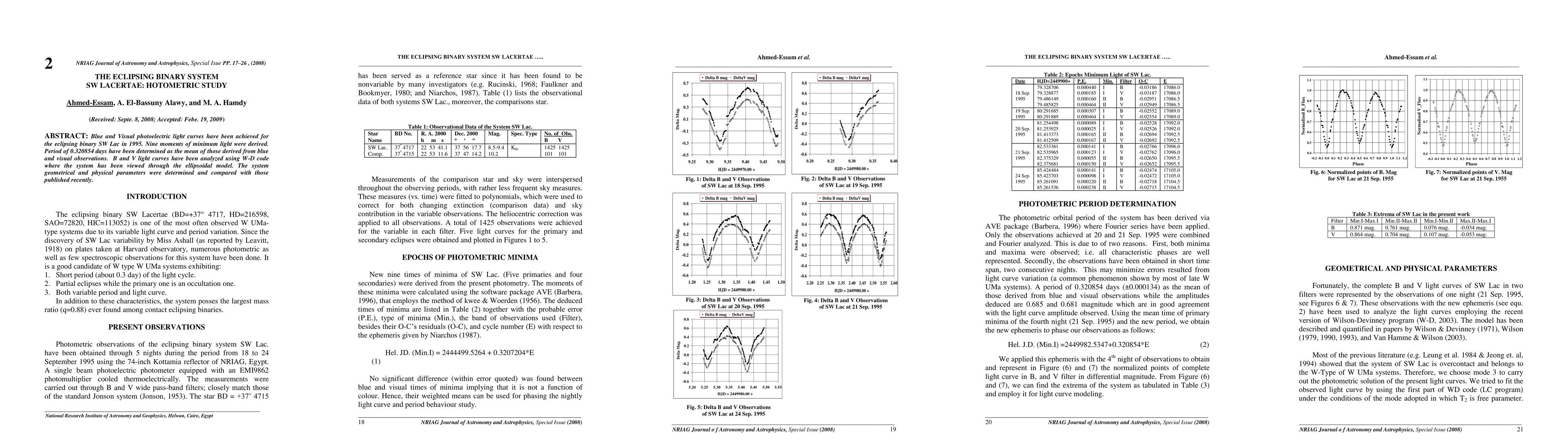 Blue and Visual photoelectric light curves have been achieved for the eclipsing binary SW Lac in 1995. Nine moments of minimum light were derived. Period of 0.320854 days have been determined as the mean of those derived from blue and visual observations. B and V light curves have been analyzed using W-D code where the system has been viewed through the ellipsoidal model. The system geometrical and physical parameters were determined and compared with those published recently.