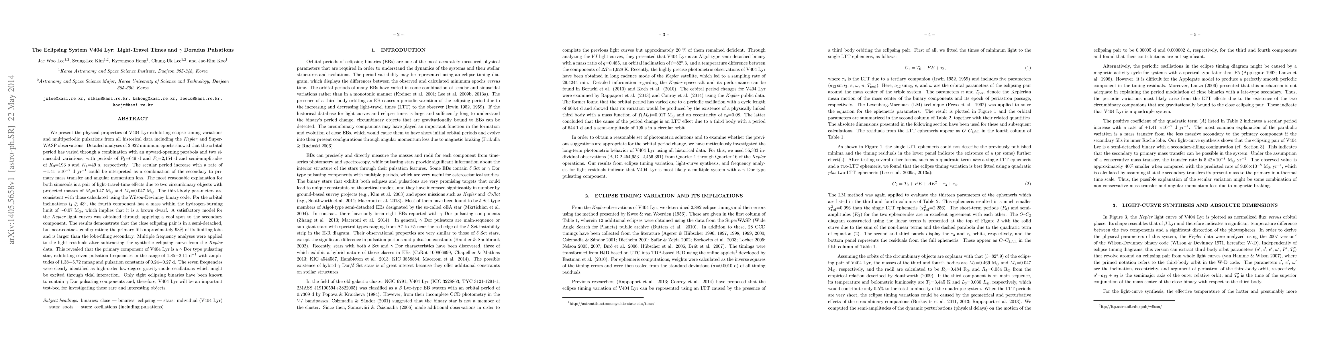 This paper analyzes the eclipsing system V404 Lyr, revealing its orbital period variations and identifying it as a $\gamma$ Dor type pulsator. The study finds evidence of light-travel-time effects from two circumbinary objects, suggesting a complex system with a brown dwarf component.