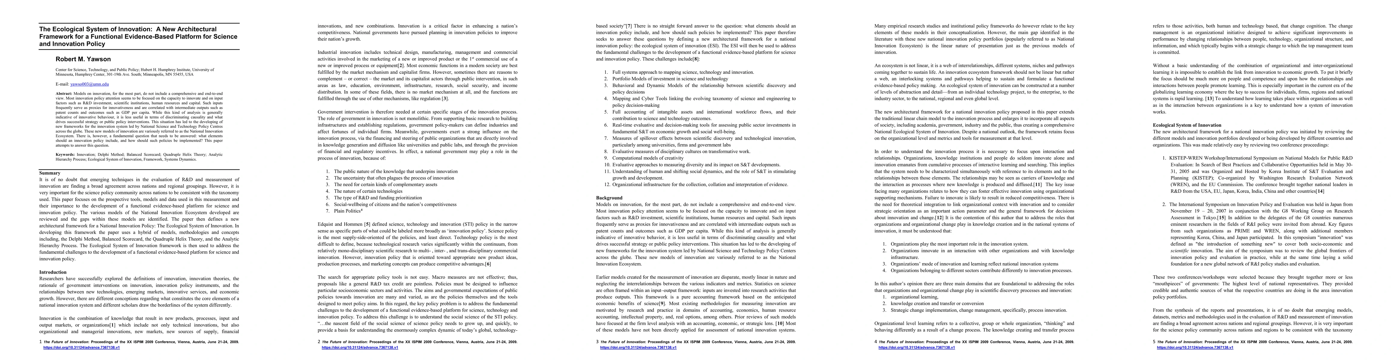 Models on innovation, for the most part, do not include a comprehensive and end-to-end view. Most innovation policy attention seems to be focused on the capacity to innovate and on input factors such as R&D investment, scientific institutions, human resources and capital. Such inputs frequently serve as proxies for innovativeness and are correlated with intermediate outputs such as patent counts and outcomes such as GDP per capita. While this kind of analysis is generally indicative of innovative behaviour, it is less useful in terms of discriminating causality and what drives successful strategy or public policy interventions. This situation has led to the developing of new frameworks for the innovation system led by National Science and Technology Policy Centres across the globe. These new models of innovation are variously referred to as the National Innovation Ecosystem. There is, however, a fundamental question that needs to be answered: what elements should an innovation policy include, and how should such policies be implemented? This paper attempts to answer this question.
