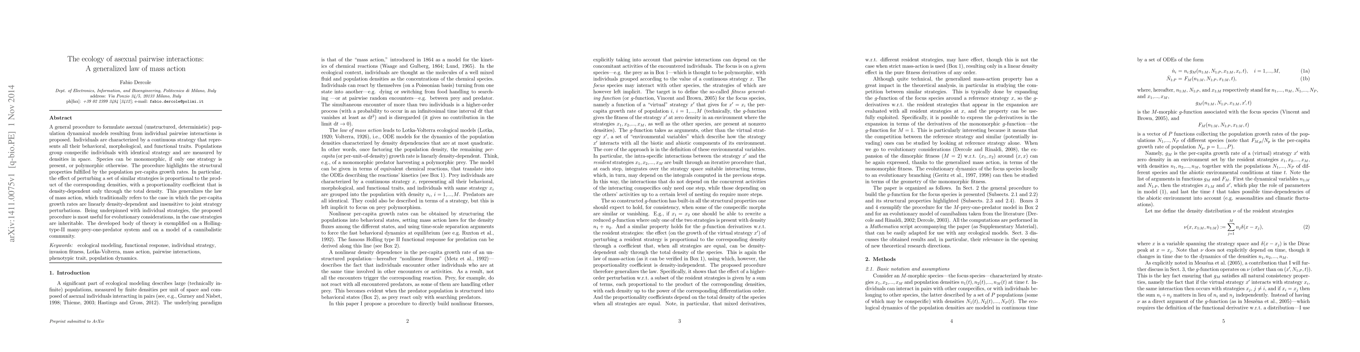 A general procedure to formulate asexual (unstructured, deterministic) population dynamical models resulting from individual pairwise interactions is proposed. Individuals are characterized by a continuous strategy that represents all their behavioral, morphological, and functional traits. Populations group conspecific individuals with identical strategy and are measured by densities in space. Species can be monomorphic, if only one strategy is present, or polymorphic otherwise. The procedure highlights the structural properties fulfilled by the population per-capita growth rates. In particular, the effect of perturbing a set of similar strategies is proportional to the product of the corresponding densities, with a proportionality coefficient that is density-dependent only through the total density. This generalizes the law of mass action, which traditionally refers to the case in which the per-capita growth rates are linearly density-dependent and insensitive to joint strategy perturbations. Being underpinned with individual strategies, the proposed procedure is most useful for evolutionary considerations, in the case strategies are inheritable. The developed body of theory is exemplified on a Holling-type-II many-prey-one-predator system and on a model of a cannibalistic community.
