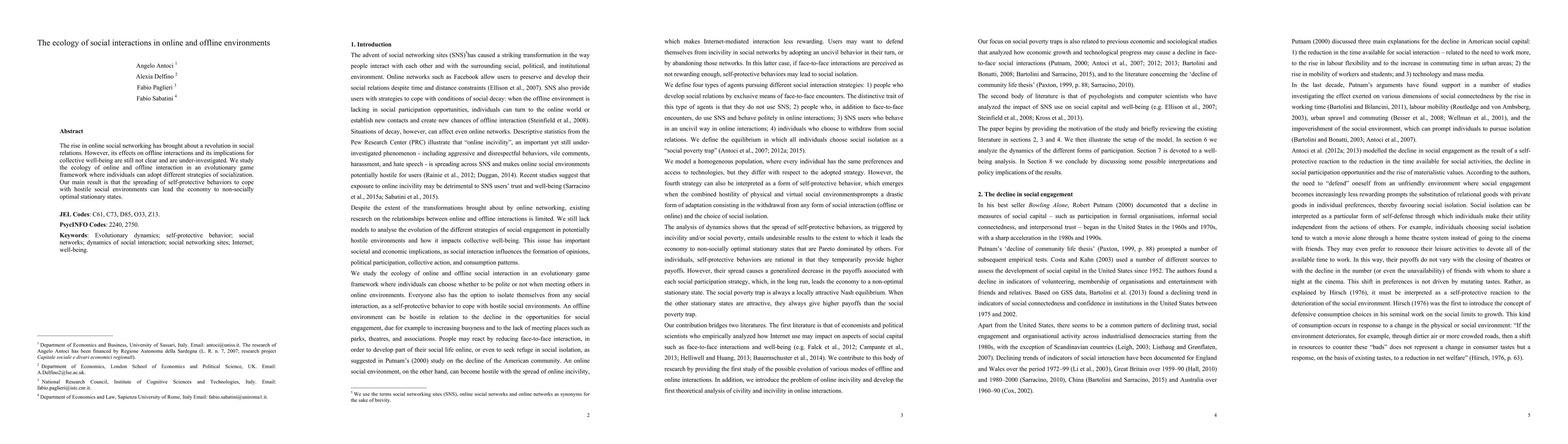 Online social networking affects offline interactions, leading to non-socially optimal states when individuals prioritize self-protection in hostile environments.