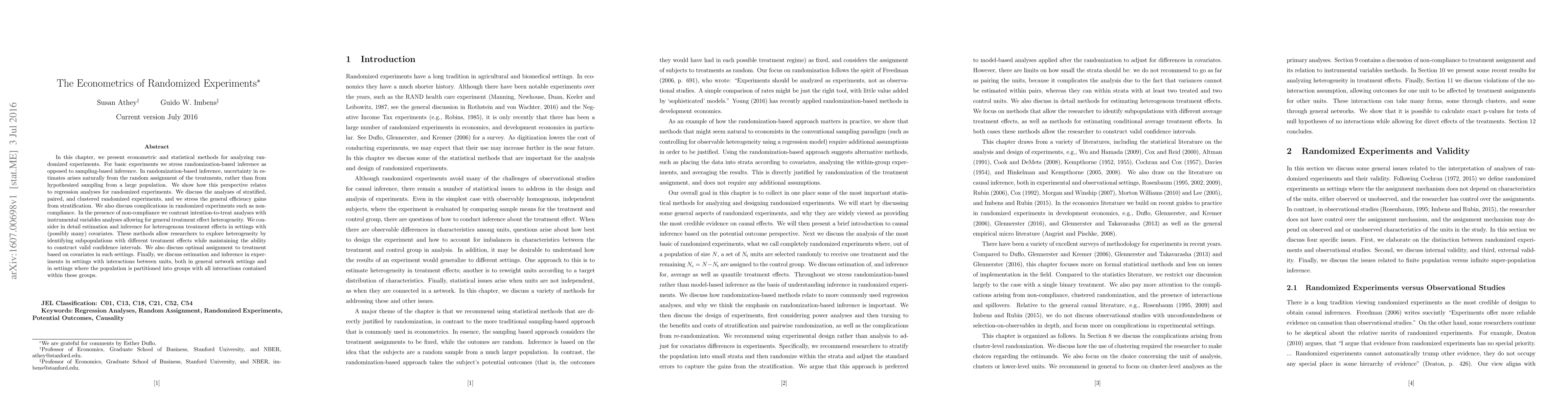 This paper reviews econometric methods for analyzing randomized experiments, emphasizing randomization-based inference over sampling-based inference. It discusses stratified, paired, and clustered designs, non-compliance issues, and optimal treatment assignment based on covariates, while also addressing interactions between units in network and grouped settings.