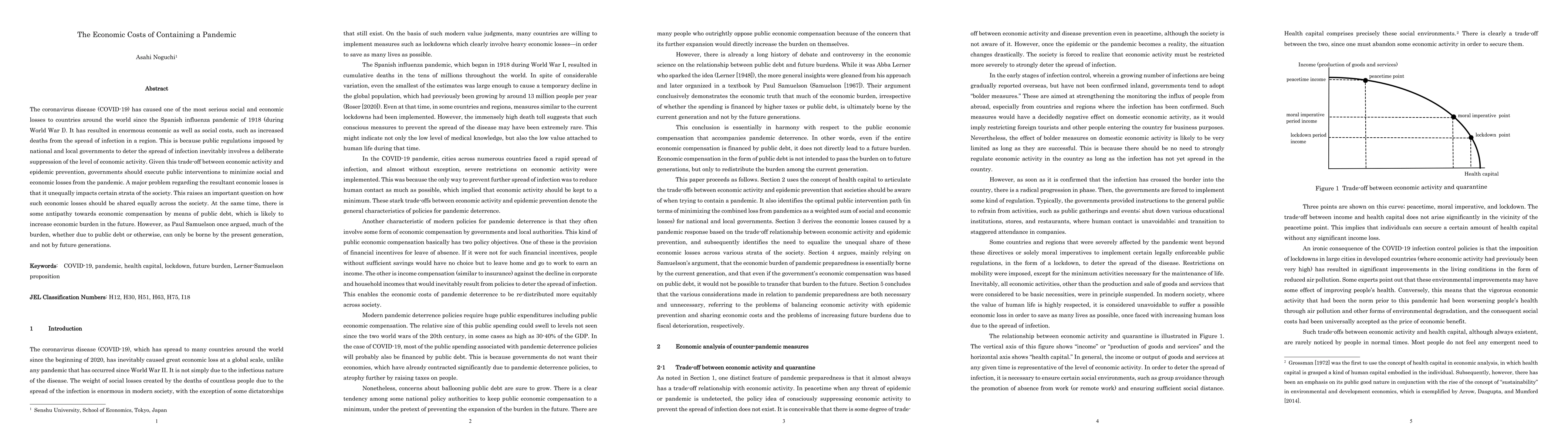 The coronavirus disease (COVID-19) has caused one of the most serious social and economic losses to countries around the world since the Spanish influenza pandemic of 1918 (during World War I). It has resulted in enormous economic as well as social costs, such as increased deaths from the spread of infection in a region. This is because public regulations imposed by national and local governments to deter the spread of infection inevitably involves a deliberate suppression of the level of economic activity. Given this trade-off between economic activity and epidemic prevention, governments should execute public interventions to minimize social and economic losses from the pandemic. A major problem regarding the resultant economic losses is that it unequally impacts certain strata of the society. This raises an important question on how such economic losses should be shared equally across the society. At the same time, there is some antipathy towards economic compensation by means of public debt, which is likely to increase economic burden in the future. However, as Paul Samuelson once argued, much of the burden, whether due to public debt or otherwise, can only be borne by the present generation, and not by future generations.