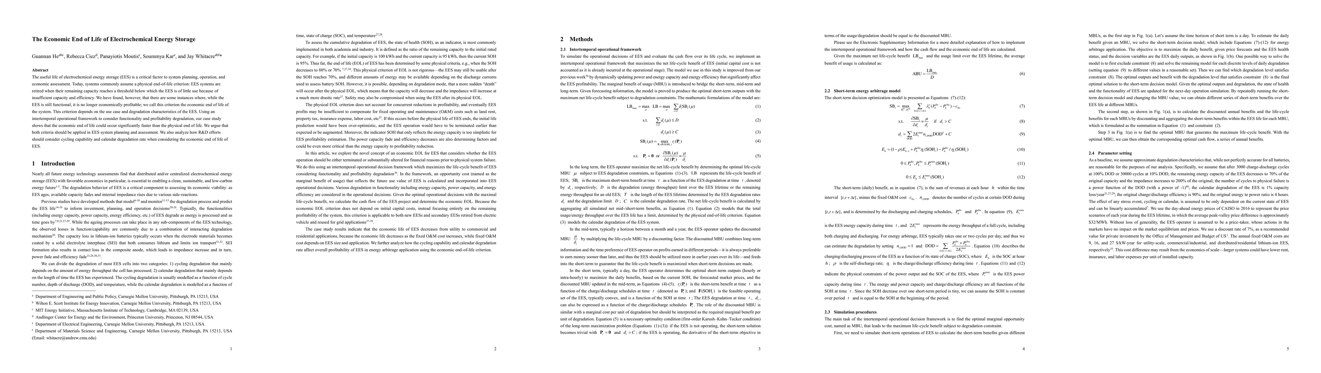 This paper proposes an economic end-of-life criterion for electrochemical energy storage (EES) based on its net economic benefit, which may occur sooner than the physical end-of-life due to functionality degradation. It suggests integrating both economic and physical criteria in EES planning and highlights the importance of R&D focusing on cycling capability and degradation rates.