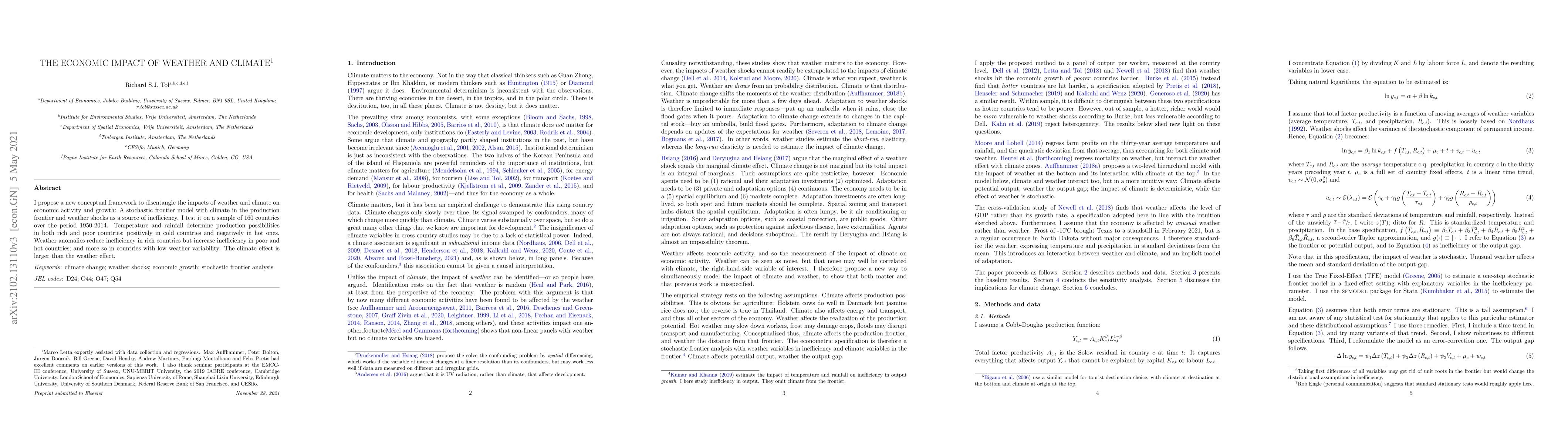 This paper introduces a new framework to analyze the economic impacts of weather and climate, finding that temperature and rainfall affect production differently across countries. Weather anomalies increase inefficiency in poorer, hotter countries, while climate effects are generally larger than weather effects.