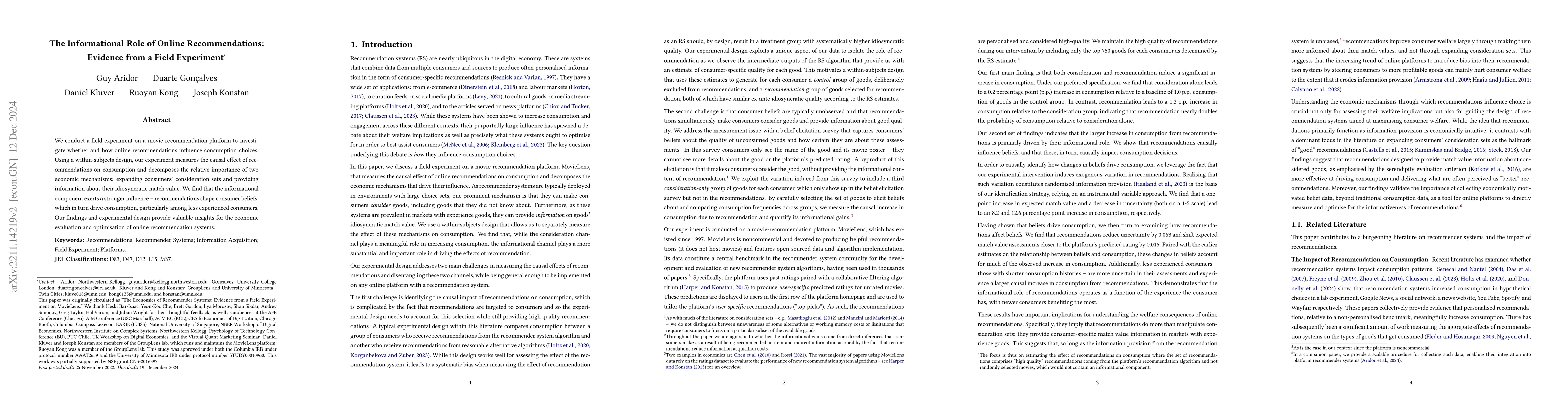 This study conducts a field experiment on a movie-recommendation platform to determine how recommendations influence consumption. It finds that recommendations not only expose consumers to new goods but also significantly increase consumption through an informational mechanism, reducing uncertainty and encouraging information acquisition.