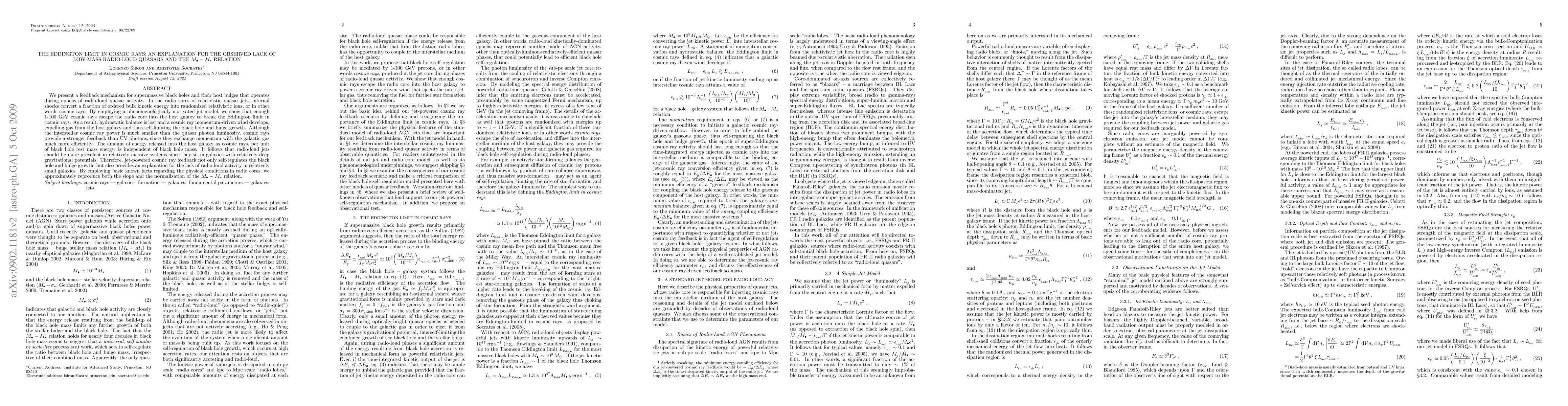 We present a feedback mechanism for supermassive black holes and their host bulges that operates during epochs of radio-loud quasar activity. In the radio cores of relativistic quasar jets, internal shocks convert a fraction of ordered bulk kinetic energy into randomized relativistic ions, or in other words cosmic rays. By employing a phenomenologically-motivated jet model, we show that enough 1-100 GeV cosmic rays escape the radio core into the host galaxy to break the Eddington limit in cosmic rays. As a result, hydrostatic balance is lost and a cosmic ray momentum-driven wind develops, expelling gas from the host galaxy and thus self-limiting the black hole and bulge growth. Although the interstellar cosmic ray power is much smaller than the quasar photon luminosity, cosmic rays provide a stronger feedback than UV photons, since they exchange momentum with the galactic gas much more efficiently. The amount of energy released into the host galaxy as cosmic rays, per unit of black hole rest mass energy, is independent of black hole mass. It follows that radio-loud jets should be more prevalent in relatively massive systems since they sit in galaxies with relatively deep gravitational potentials. Therefore, jet-powered cosmic ray feedback not only self-regulates the black hole and bulge growth, but also provides an explanation for the lack of radio-loud activity in relatively small galaxies. By employing basic known facts regarding the physical conditions in radio cores, we approximately reproduce both the slope and the normalization of the M_{BH}-M_{Bulge} relation.