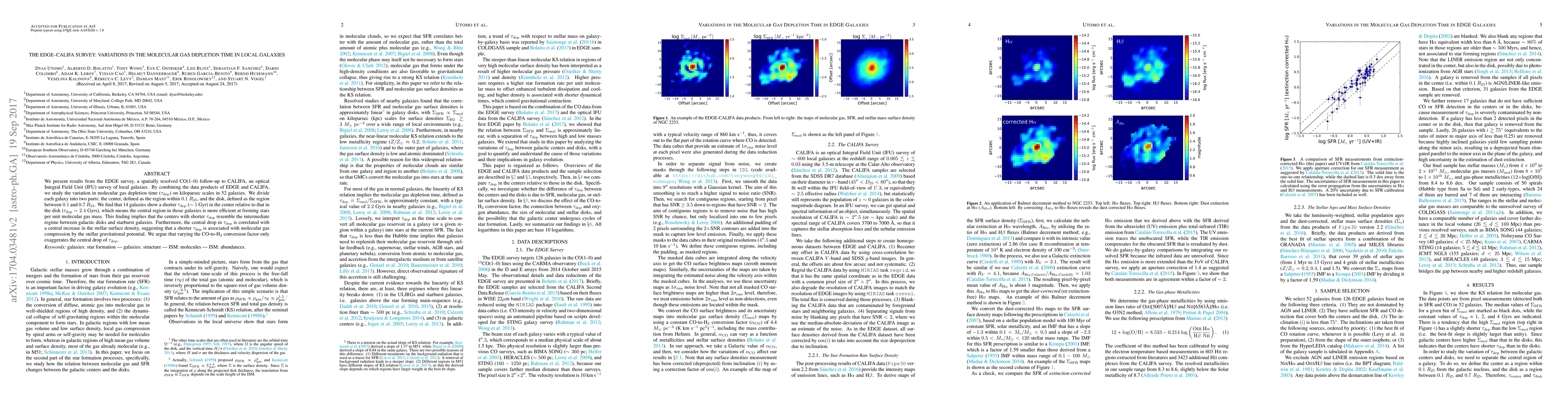 The EDGE-CALIFA survey investigates variations in molecular gas depletion time across local galaxies, finding that 14 galaxies exhibit shorter depletion times in their centers compared to their disks, indicating more efficient star formation in central regions. This central efficiency correlates with increased stellar surface density, suggesting gravitational compression of molecular gas.