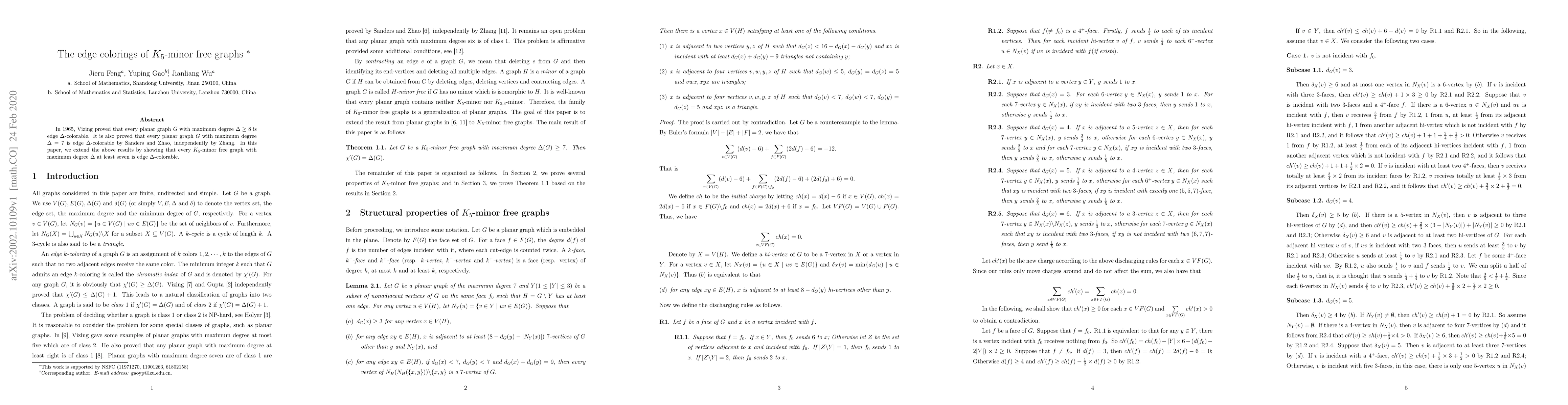 This paper extends Vizing's theorem on planar graph edge coloring. It proves that $K_5$-minor free graphs with maximum degree at least seven are edge $Delta$-colorable, building upon previous work that established the same for planar graphs with degrees eight and seven.