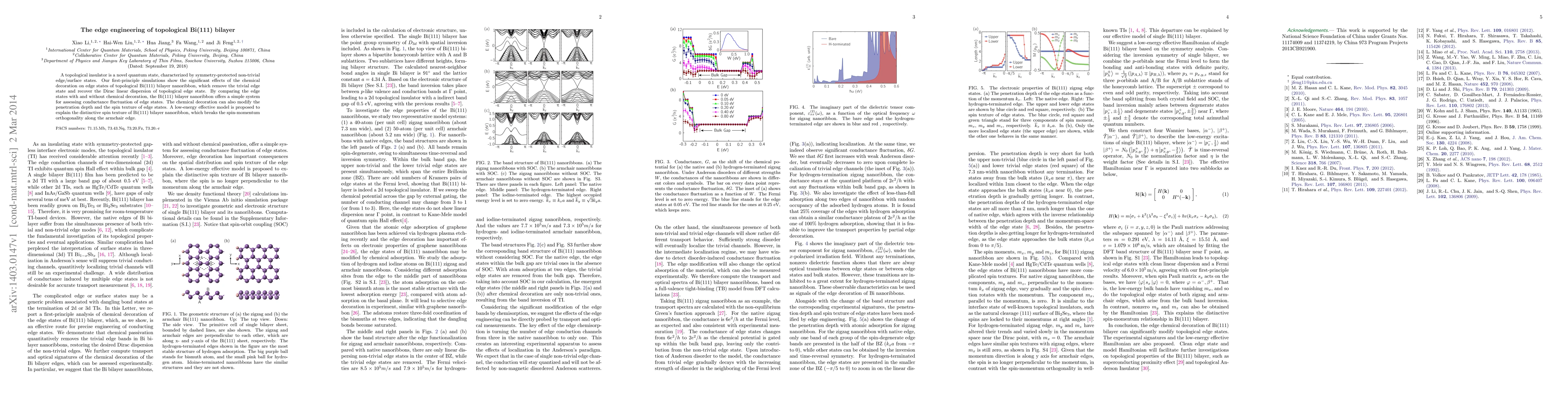 A topological insulator is a novel quantum state, characterized by symmetry-protected non-trivial edge/surface states. Our first-principle simulations show the significant effects of the chemical decoration on edge states of topological Bi(111) bilayer nanoribbon, which remove the trivial edge state and recover the Dirac linear dispersion of topological edge state. By comparing the edge states with and without chemical decoration, the Bi(111) bilayer nanoribbon offers a simple system for assessing conductance fluctuation of edge states. The chemical decoration can also modify the penetration depth and the spin texture of edge states. A low-energy effective model is proposed to explain the distinctive spin texture of Bi(111) bilayer nanoribbon, which breaks the spin-momentum orthogonality along the armchair edge.
