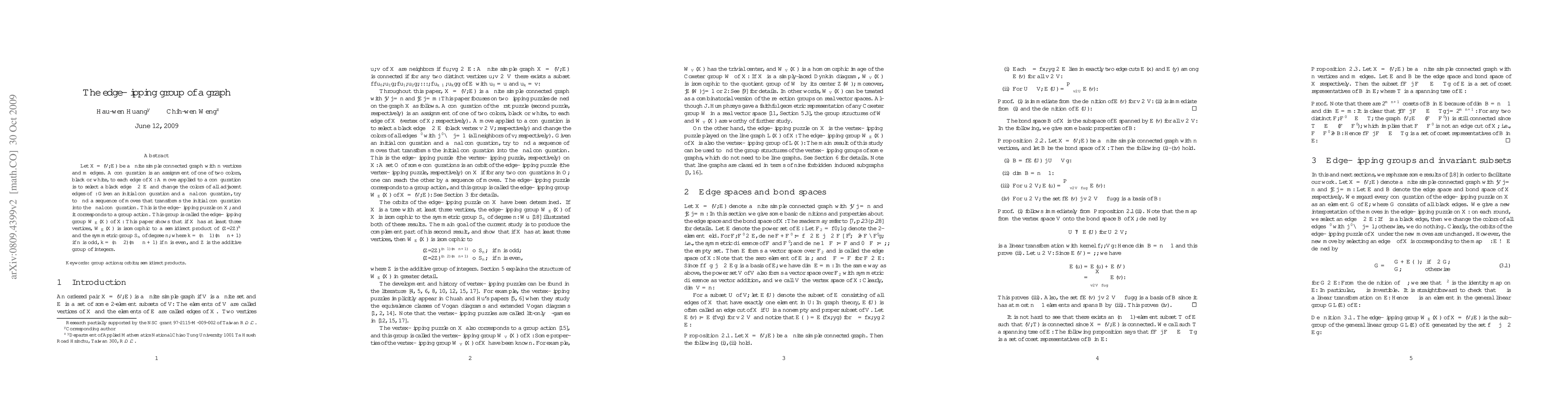 Let $X=(V,E)$ be a finite simple connected graph with $n$ vertices and $m$ edges. A configuration is an assignment of one of two colors, black or white, to each edge of $X.$ A move applied to a configuration is to select a black edge $\epsilon\in E$ and change the colors of all adjacent edges of $\epsilon.$ Given an initial configuration and a final configuration, try to find a sequence of moves that transforms the initial configuration into the final configuration. This is the edge-flipping puzzle on $X,$ and it corresponds to a group action. This group is called the edge-flipping group $\mathbf{W}_E(X)$ of $X.$ This paper shows that if $X$ has at least three vertices, $\mathbf{W}_E(X)$ is isomorphic to a semidirect product of $(\mathbb{Z}/2\mathbb{Z})^k$ and the symmetric group $S_n$ of degree $n,$ where $k=(n-1)(m-n+1)$ if $n$ is odd, $k=(n-2)(m-n+1)$ if $n$ is even, and $\mathbb{Z}$ is the additive group of integers.