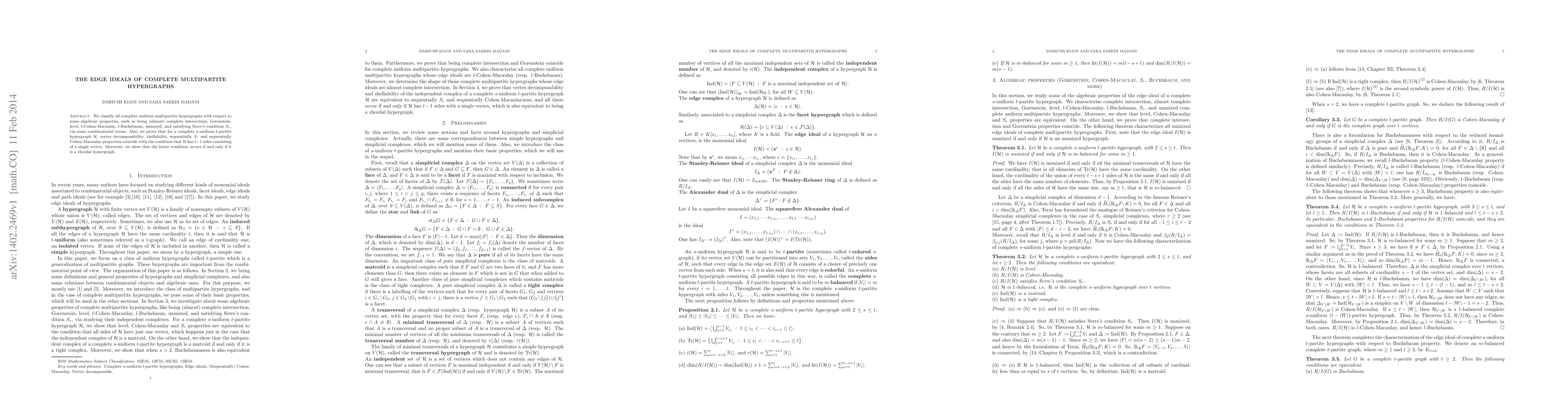 We classify all complete uniform multipartite hypergraphs with respect to some algebraic properties, such as being (almost) complete intersection, Gorenstein, level, $l$-Cohen-Macaulay, $l$-Buchsbaum, unmixed, and satisfying Serre's condition $S_r$, via some combinatorial terms. Also, we prove that for a complete $s$-uniform $t$-partite hypergraph $H$, vertex decomposability, shellability, sequentially $S_r$ and sequentially Cohen-Macaulay properties coincide with the condition that $H$ has $t-1$ sides consisting of a single vertex. Moreover, we show that the latter condition occurs if and only if it is a chordal hypergraph.