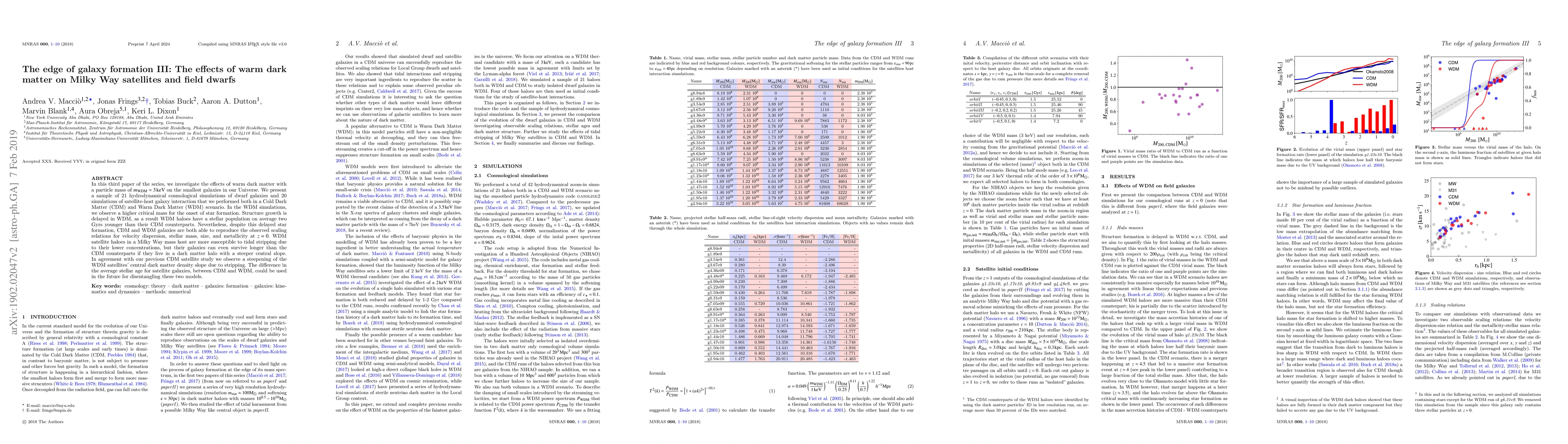 In this third paper of the series, we investigate the effects of warm dark matter with a particle mass of $m_\mathrm{WDM}=3\,\mathrm{keV}$ on the smallest galaxies in our Universe. We present a sample of 21 hydrodynamical cosmological simulations of dwarf galaxies and 20 simulations of satellite-host galaxy interaction that we performed both in a Cold Dark Matter (CDM) and Warm Dark Matter (WDM) scenario. In the WDM simulations, we observe a higher critical mass for the onset of star formation. Structure growth is delayed in WDM, as a result WDM haloes have a stellar population on average two Gyrs younger than their CDM counterparts. Nevertheless, despite this delayed star formation, CDM and WDM galaxies are both able to reproduce the observed scaling relations for velocity dispersion, stellar mass, size, and metallicity at $z=0$. WDM satellite haloes in a Milky Way mass host are more susceptible to tidal stripping due to their lower concentrations, but their galaxies can even survive longer than the CDM counterparts if they live in a dark matter halo with a steeper central slope. In agreement with our previous CDM satellite study we observe a steepening of the WDM satellites' central dark matter density slope due to stripping. The difference in the average stellar age for satellite galaxies, between CDM and WDM, could be used in the future for disentangling these two models.