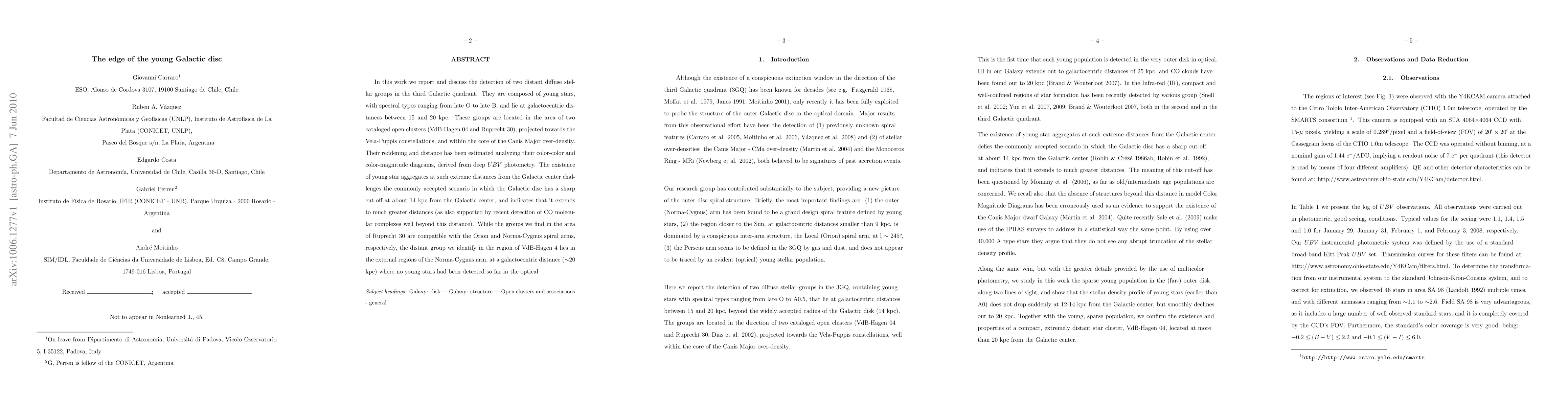 In this work we report and discuss the detection of two distant diffuse stellar groups in the third Galactic quadrant. They are composed of young stars, with spectral types ranging from late O to late B, and lie at galactocentric distances between 15 and 20 kpc. These groups are located in the area of two cataloged open clusters (VdB-Hagen~04 and Ruprecht~30), projected towards the Vela-Puppis constellations, and within the core of the Canis Major over-density. Their reddening and distance has been estimated analyzing their color-color and color-magnitude diagrams, derived from deep $UBV$ photometry. The existence of young star aggregates at such extreme distances from the Galactic center challenges the commonly accepted scenario in which the Galactic disc has a sharp cut-off at about 14 kpc from the Galactic center, and indicates that it extends to much greater distances (as also supported by recent detection of CO molecular complexes well beyond this distance). While the groups we find in the area of Ruprecht~30 are compatible with the Orion and Norma-Cygnus spiral arms, respectively, the distant group we identify in the region of VdB-Hagen~4 lies in the external regions of the Norma-Cygnus arm, at a galactocentric distance ($\sim$20 kpc) where no young stars had been detected so far in the optical.