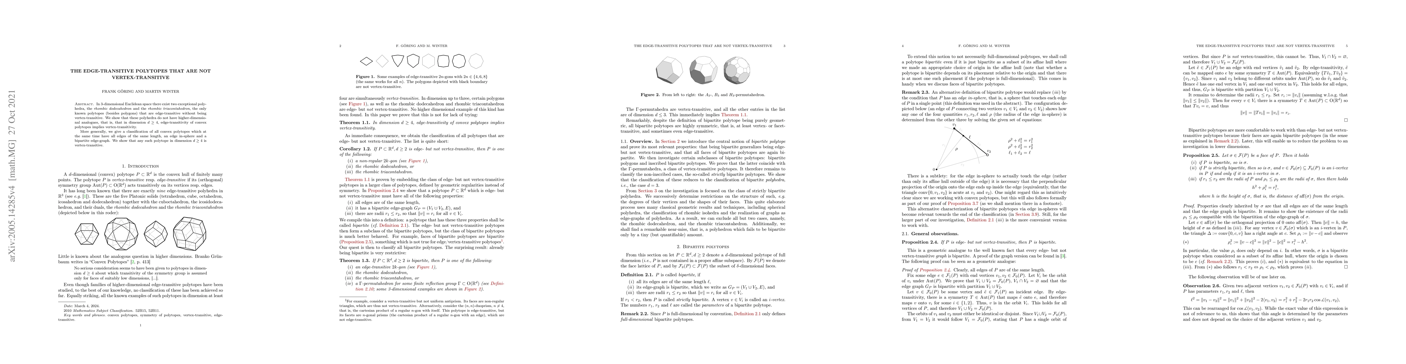 This paper identifies the only known 3-dimensional edge-transitive polyhedra, the rhombic dodecahedron and rhombic triacontahedron, and proves there are no such higher-dimensional analogues in dimensions $d\ge 4$. It also classifies convex polytopes with uniform edge lengths, an edge in-sphere, and a bipartite edge-graph, showing that all such polytopes in dimensions $d\ge 4$ are vertex-transitive.