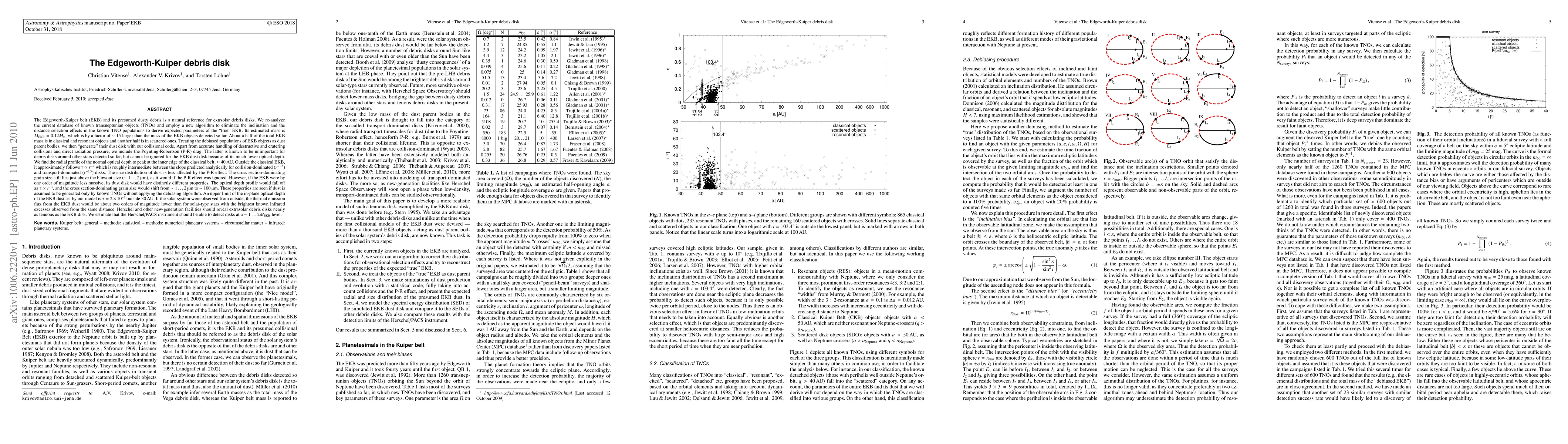 (Abridged) The Edgeworth-Kuiper belt with its presumed dusty debris is a natural reference for extrsolar debris disks. We employ a new algorithm to eliminate the inclination and the distance selection effects in the known TNO populations to derive expected parameters of the "true" EKB. Its estimated mass is M_EKB=0.12 M_earth, which is by a factor of \sim 15 larger than the mass of the EKB objects detected so far. About a half of the total EKB mass is in classical and resonant objects and another half is in scattered ones. Treating the debiased populations of EKB objects as dust parent bodies, we then "generate" their dust disk with our collisional code. Apart from accurate handling of collisions and direct radiation pressure, we include the Poynting-Robertson (P-R) drag, which cannot be ignored for the EKB dust disk. Outside the classical EKB, the radial profile of the optical depth approximately follows tau \sim r^-2 which is roughly intermediate between the slope predicted analytically for collision-dominated (r^-1.5) and transport-dominated (r^-2.5) disks. The cross section-dominating grain size still lies just above the blowout size (\sim 1...2 \microm), as it would without the P-R transport. However, if the EKB were by one order of magnitude less massive, the optical depth profile would fall off as tau \sim r^-3, and the cross section-dominating grain size would shift from \sim 1...2\microm to ~100 \microm. These properties are seen if dust is assumed to be generated only by known TNOs. If the solar system were observed from outside, the thermal emission flux from the EKB dust would be about two orders of magnitude lower than for solar-type stars with the brightest known infrared excesses observed from the same distance. Herschel and other new-generation facilities should reveal extrasolar debris disks nearly as tenuous as the EKB disk. The Herschel/PACS instrument should be able to detect disks at a \sim 1...2M_EKB level.