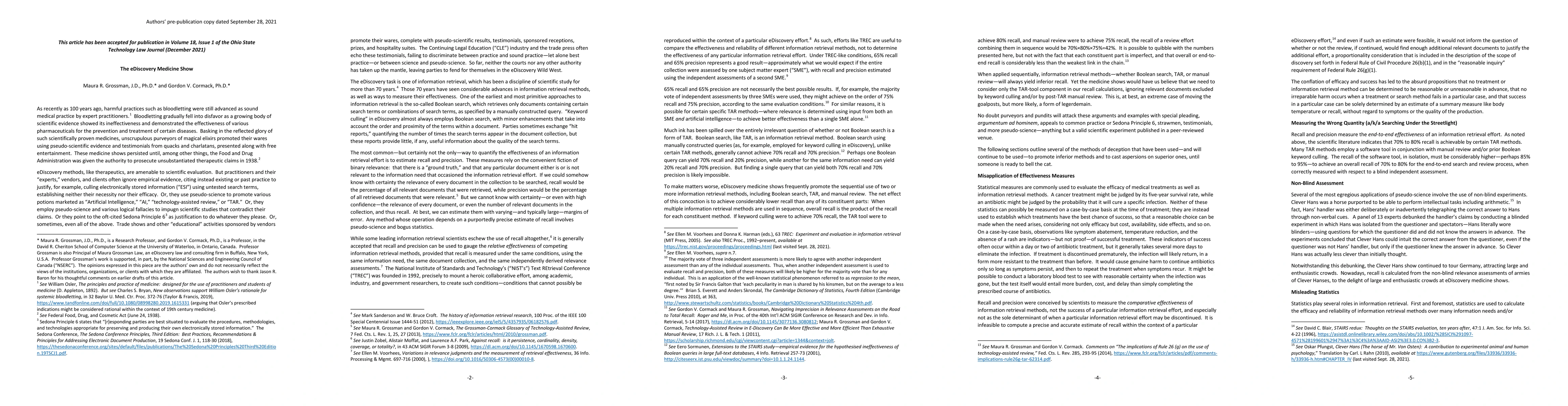 The practice of bloodletting gradually fell into disfavor as a growing body of scientific evidence showed its ineffectiveness and demonstrated the effectiveness of various pharmaceuticals for the prevention and treatment of certain diseases. At the same time, the patent medicine industry promoted ineffective remedies at medicine shows featuring entertainment, testimonials, and pseudo-scientific claims with all the trappings--but none of the methodology--of science. Today, many producing parties and eDiscovery vendors similarly promote obsolete technology as well as unvetted tools labeled "artificial intelligence" or "technology-assisted review," along with unsound validation protocols. This situation will end only when eDiscovery technologies and tools are subject to testing using the methods of information retrieval.