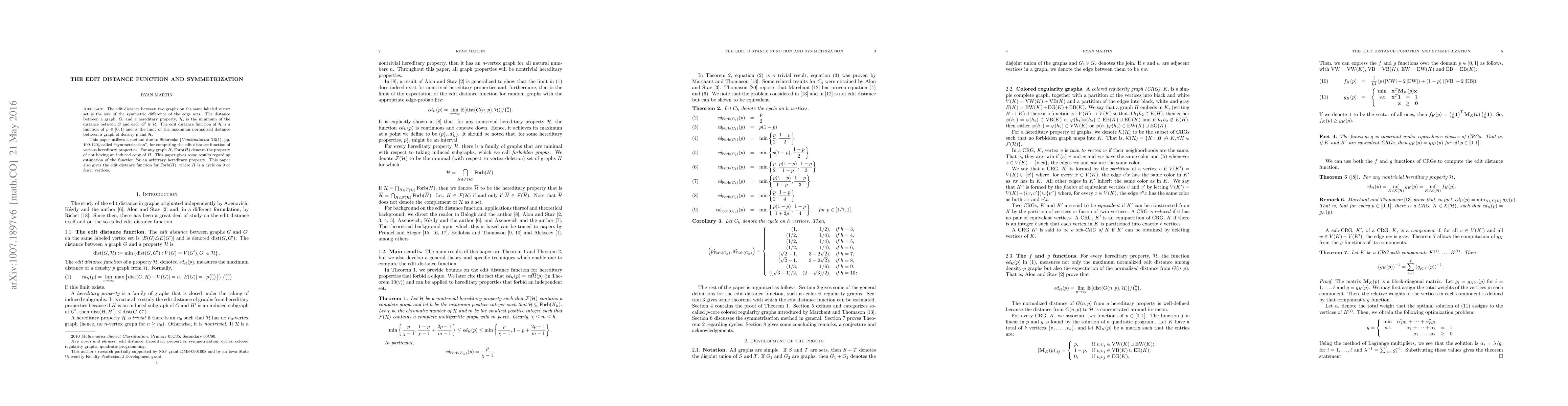 The edit distance between two graphs on the same labeled vertex set is the size of the symmetric difference of the edge sets. The distance between a graph, $G$, and a hereditary property, ${\cal H}$, is the minimum of the distance between $G$ and each $G'\in{\cal H}$. The edit distance function of ${\cal H}$ is a function of $p\in[0,1]$ and is the limit of the maximum normalized distance between a graph of density $p$ and ${\cal H}$. This paper develops a method, called localization, for computing the edit distance function of various hereditary properties. For any graph $H$, ${\rm Forb}(H)$ denotes the property of not having an induced copy of $H$. This paper gives some results regarding estimation of the function for an arbitrary hereditary property. This paper also gives the edit distance function for ${\rm Forb}(H)$, where $H$ is a cycle on 9 or fewer vertices.
