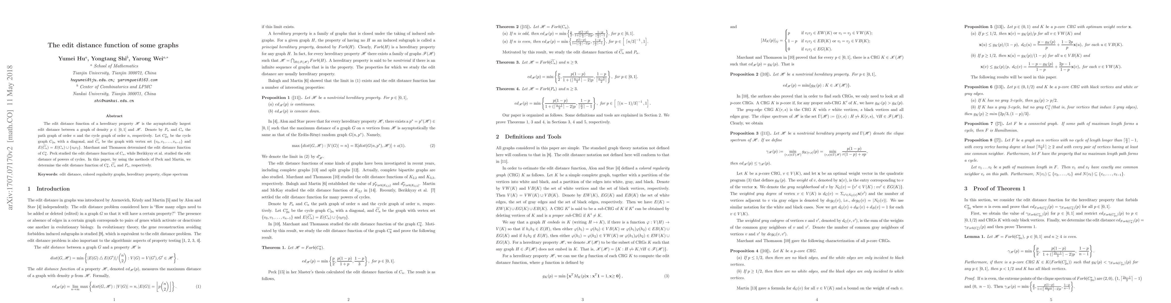 The edit distance function of a hereditary property $\mathscr{H}$ is the asymptotically largest edit distance between a graph of density $p\in[0,1]$ and $\mathscr{H}$. Denote by $P_n$ and $C_n$ the path graph of order $n$ and the cycle graph of order $n$, respectively. Let $C_{2n}^*$ be the cycle graph $C_{2n}$ with a diagonal, and $\widetilde{C_n}$ be the graph with vertex set $\{v_0, v_1, \ldots, v_{n-1}\}$ and $E(\widetilde{C_n})=E(C_n)\cup \{v_0v_2\}$. Marchant and Thomason determined the edit distance function of $C_6^{*}$. Peck studied the edit distance function of $C_n$, while Berikkyzy et al. studied the edit distance of powers of cycles. In this paper, by using the methods of Peck and Martin, we determine the edit distance function of $C_8^{*}$, $\widetilde{C_n}$ and $P_n$, respectively.
