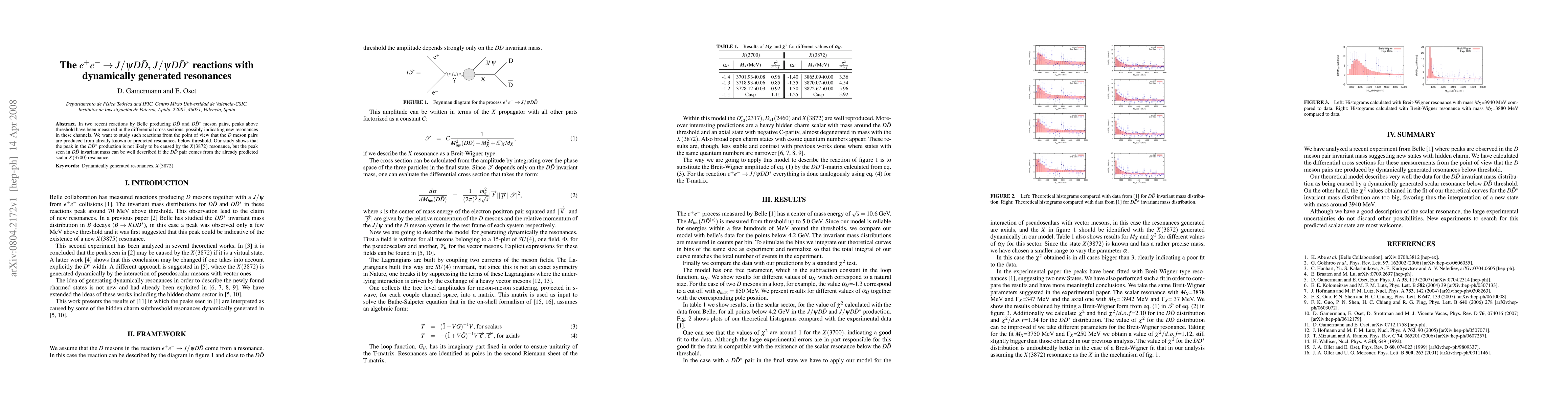 In two recent reactions by Belle producing $D\bar D$ and $D\bar D^*$ meson pairs, peaks above threshold have been measured in the differential cross sections, possibly indicating new resonances in these channels. We want to study such reactions from the point of view that the $D$ meson pairs are produced from already known or predicted resonances below threshold. Our study shows that the peak in the $D\bar D^*$ production is not likely to be caused by the X(3872) resonance, but the peak seen in $D\bar D$ invariant mass can be well described if the $D\bar D$ pair comes from the already predicted scalar X(3700) resonance.
