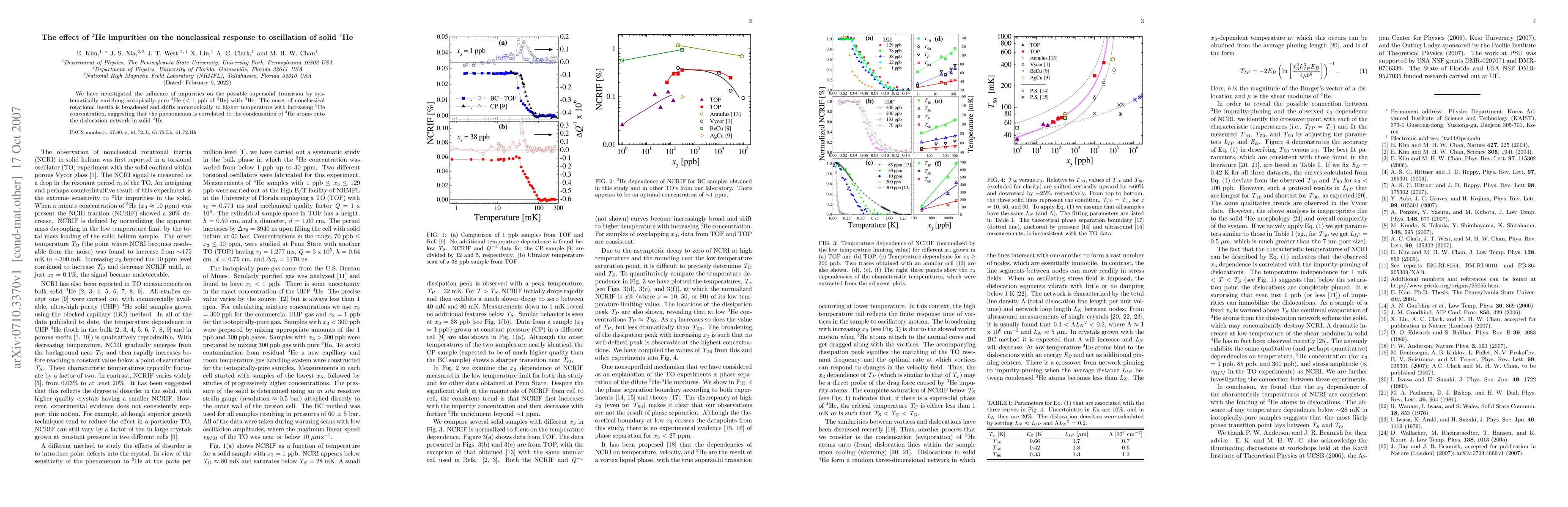 Summary: This study examines how 3He impurities affect the nonclassical rotational inertia in solid 4He, finding that the onset of this phenomenon shifts to higher temperatures with increased 3He concentration, indicating a correlation with the condensation of 3He atoms on dislocations.