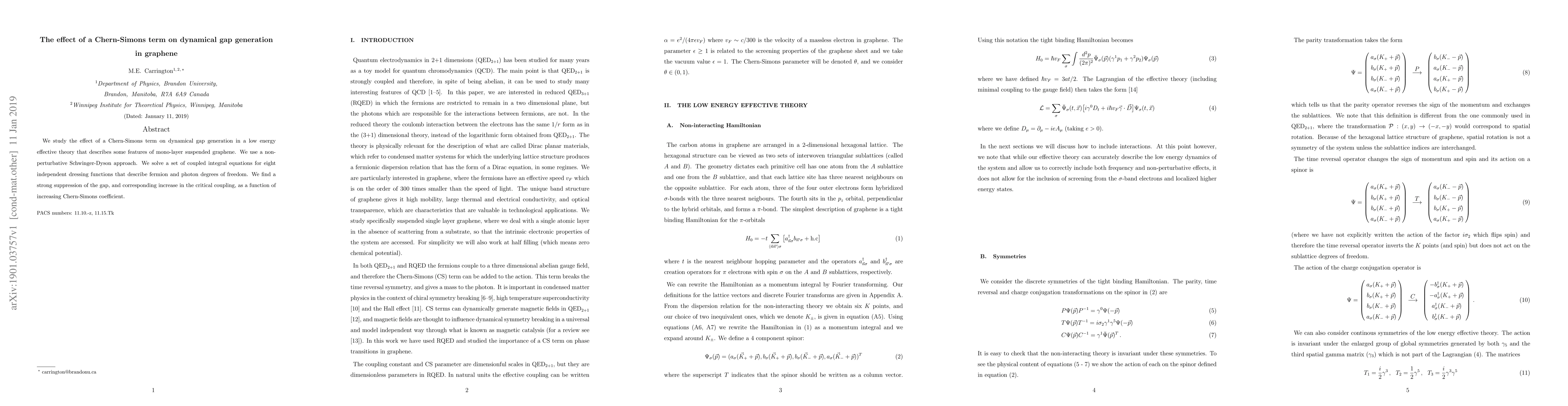We study the effect of a Chern-Simons term on dynamical gap generation in a low energy effective theory that describes some features of mono-layer suspended graphene. We use a non-perturbative Schwinger-Dyson approach. We solve a set of coupled integral equations for eight independent dressing functions that describe fermion and photon degrees of freedom. We find a strong suppression of the gap, and corresponding increase in the critical coupling, as a function of increasing Chern-Simons coefficient.