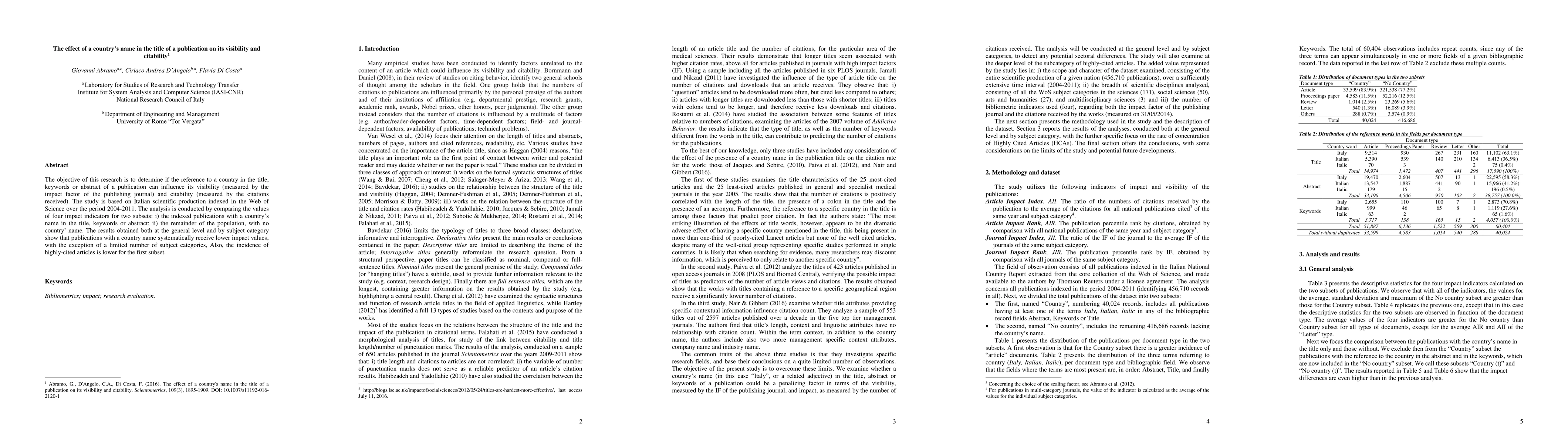 This research investigates whether mentioning a country in a publication's title, keywords, or abstract affects its visibility and citability. Findings from Italian scientific production indexed in Web of Science (2004-2011) indicate that such references generally lead to lower impact values and fewer citations, except in some specific subject categories.