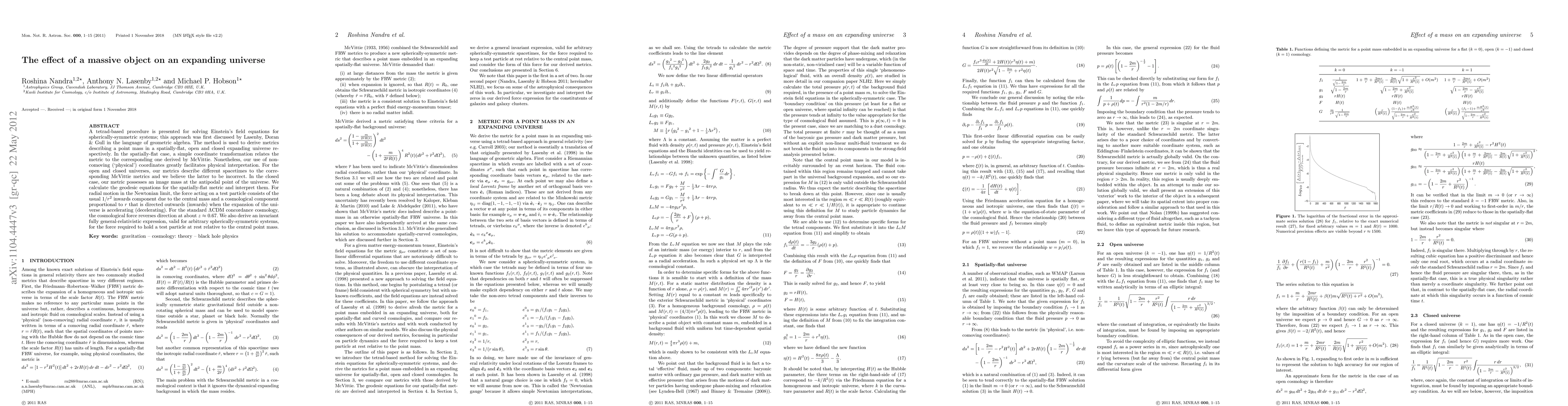 This paper presents a tetrad-based method to solve Einstein's field equations for spherically-symmetric systems, deriving metrics for a point mass in expanding universes. It finds that the standard McVittie metrics may be incorrect, especially in open and closed universes, and introduces a cosmological force component affecting radial motion.