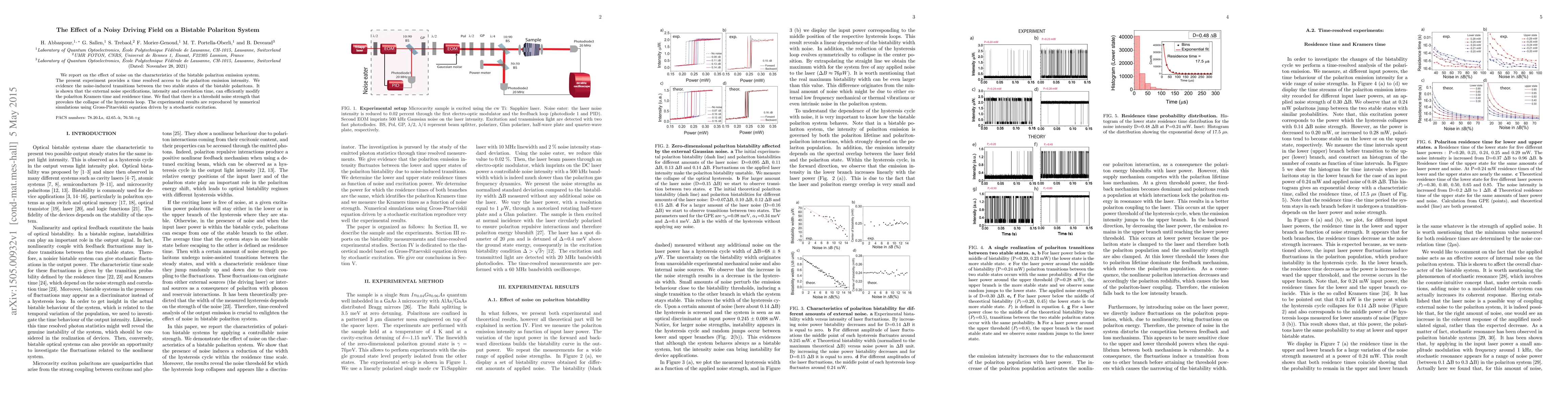 We report on the effect of noise on the characteristics of the bistable polariton emission system. The present experiment provides a time resolved access to the polariton emission intensity. We evidence the noise-induced transitions between the two stable states of the bistable polaritons. It is shown that the external noise specifications, intensity and correlation time, can efficiently modify the polariton Kramers time and residence time. We find that there is a threshold noise strength that provokes the collapse of the hysteresis loop. The experimental results are reproduced by numerical simulations using Gross-Pitaeviskii equation driven by a stochastic excitation.
