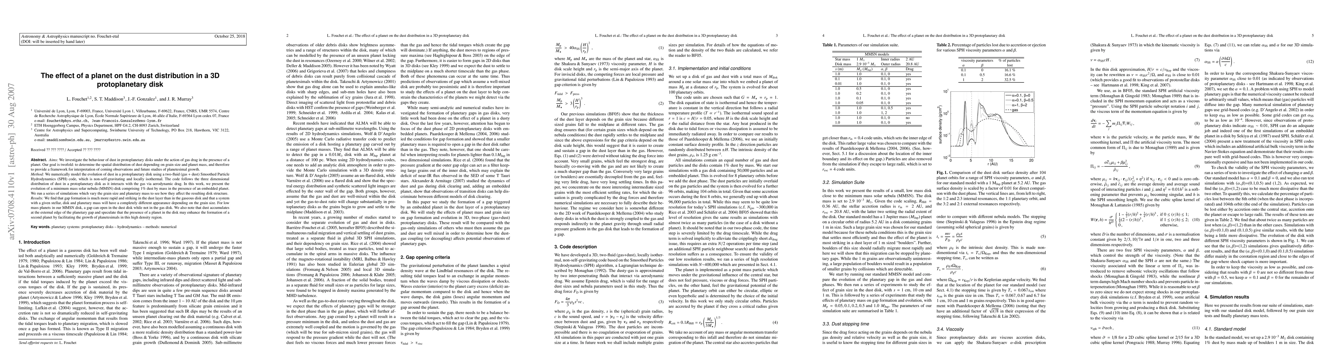 Aims: We investigate the behaviour of dust in protoplanetary disks under the action of gas drag in the presence of a planet. Our goal is twofold: to determine the spatial distribution of dust depending on grain size and planet mass, and therefore to provide a framework for interpretation of coming observations and future studies of planetesimal growth. Method: We numerically model the evolution of dust in a protoplanetary disk using a two-fluid (gas + dust) Smoothed Particle Hydrodynamics (SPH) code, which is non-self-gravitating and locally isothermal. The code follows the three dimensional distribution of dust in a protoplanetary disk as it interacts with the gas via aerodynamic drag. In this work, we present the evolution of a minimum mass solar nebula (MMSN) disk comprising 1% dust by mass in the presence of an embedded planet. We run a series of simulations which vary the grain size and planetary mass to see how they affect the resulting disk structure. Results: We find that gap formation is much more rapid and striking in the dust layer than in the gaseous disk and that a system with a given stellar, disk and planetary mass will have a completely different appearance depending on the grain size. For low mass planets in our MMSN disk, a gap can open in the dust disk while not in the gas disk. We also note that dust accumulates at the external edge of the planetary gap and speculate that the presence of a planet in the disk may enhance the formation of a second planet by facilitating the growth of planetesimals in this high density region.