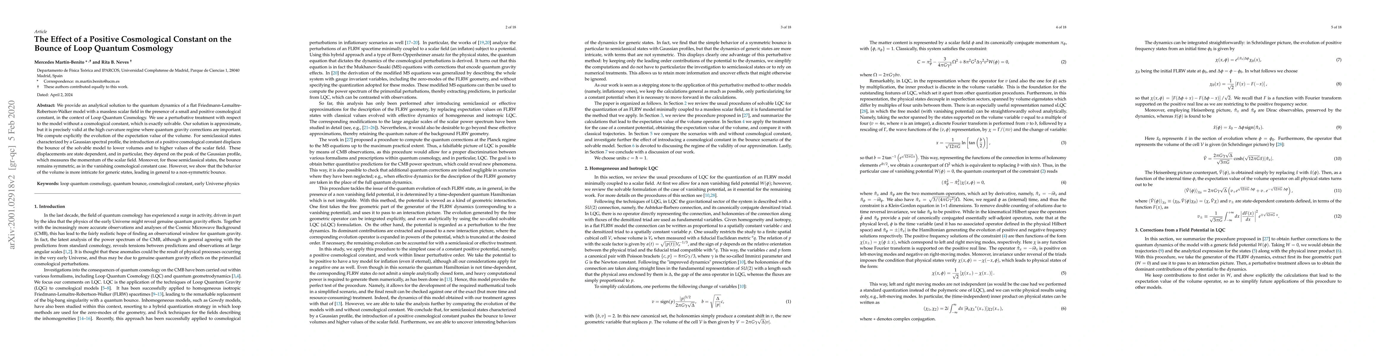 We provide an analytical solution to the quantum dynamics of a flat Friedmann-Lema\^itre- Robertson-Walker model with a massless scalar field in the presence of a small and positive cosmological constant, in the context of Loop Quantum Cosmology. We use a perturbative treatment with respect to the model without a cosmological constant, which is exactly solvable. Our solution is approximate, but it is precisely valid at the high curvature regime where quantum gravity corrections are important. We compute explicitly the evolution of the expectation value of the volume. For semiclassical states characterized by a Gaussian spectral profile, the introduction of a positive cosmological constant displaces the bounce of the solvable model to lower volumes and to higher values of the scalar field. These displacements are state dependent, and in particular, they depend on the peak of the Gaussian profile, which measures the momentum of the scalar field. Moreover, for those semiclassical states, the bounce remains symmetric, as in the vanishing cosmological constant case. However, we show that the behavior of the volume is more intricate for generic states, leading in general to a non-symmetric bounce.